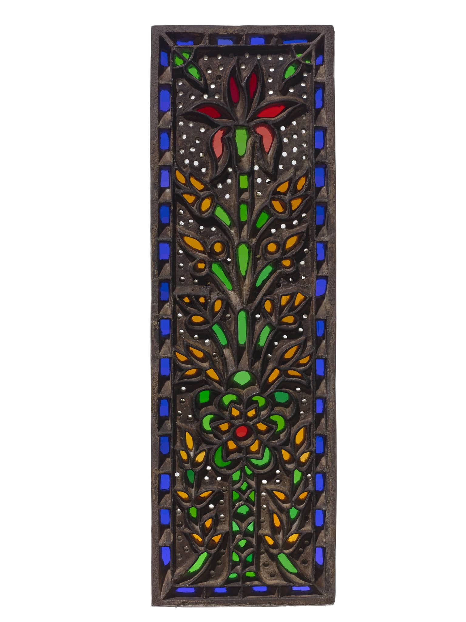 Oblong stucco and glass window showing a tree with nine symmetrically arranged sprouting branches within a blue frame. Apart from the central lily in red, it is not possible to identify the specific species of the other flowers. The trunk, backed with green glass, shows a geometric subdivision. A six-petalled blossom marks the transition from the trunk to the branches. Two flower stems with yellow blossoms spring from the lower corners and flank the trunk. The tree is worked out in relief against a perforated background, which is slightly recessed.