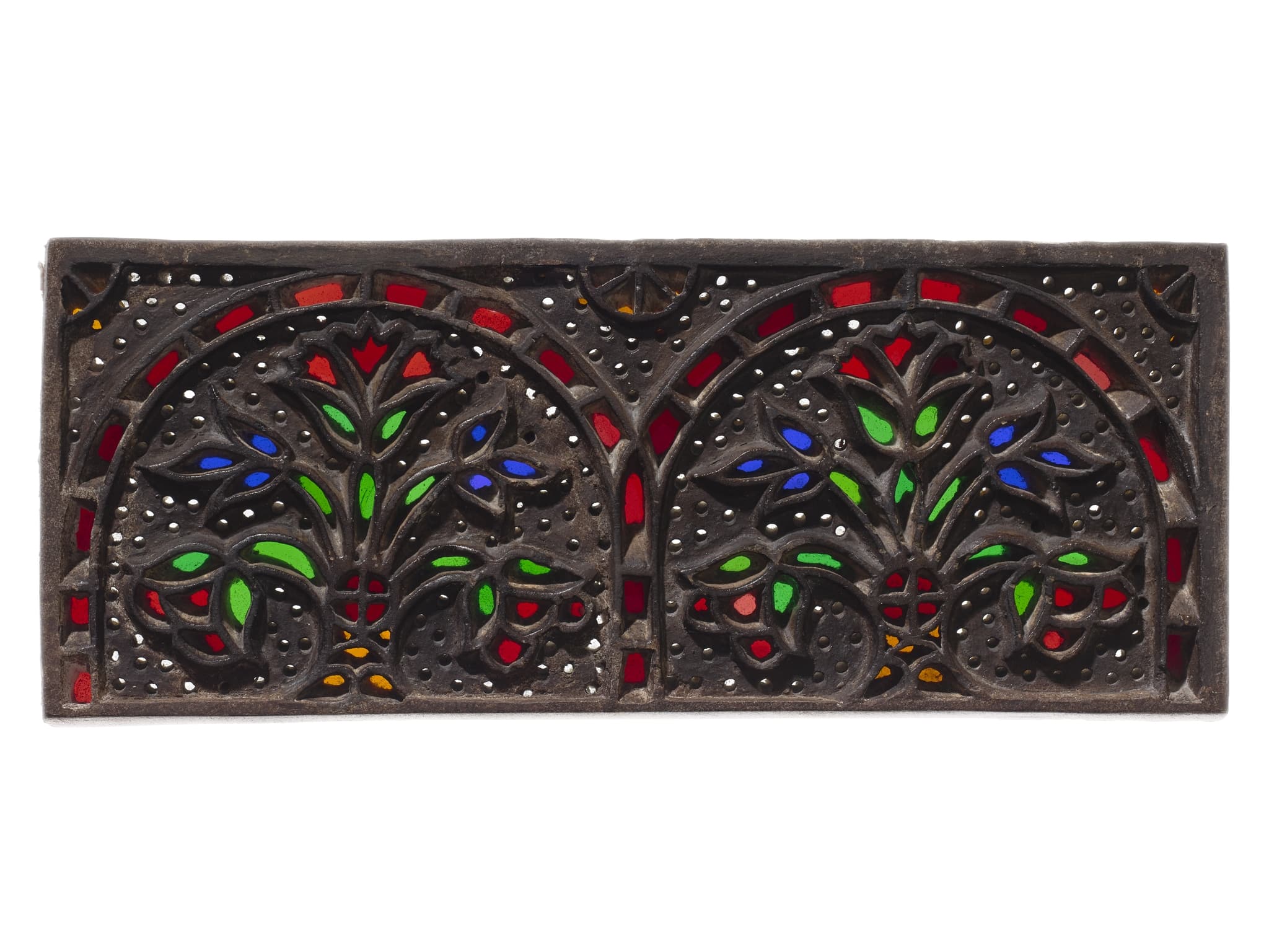 In the Louvre window discussed here, the Tree of Life motif was doubled and placed in a double arcade. Its composition is almost identical to that of stucco and glass window OA 7466/17, also held at the Musée du Louvre, which was most probably made at the same workshop. In addition to these two windows, seven other qamariyyāt within the collection of the Musée du Louvre show the Tree of Life motif (see for instance IG_6, IG_8, IG_21, IG_24, IG_28). Among them, several pairs of windows can be distinguished. The colours and properties of the glass as well as the state of preservation of the grille – although heavily restored – suggest that the window dates to the late 19th century. This assumption is supported by the results of an analytical study of glass from two stucco and glass windows from the Louvre collection (OA 7466/7, OA 7466/25) conducted by a team from the Musée du Louvre (Fellinger et al., 2022).