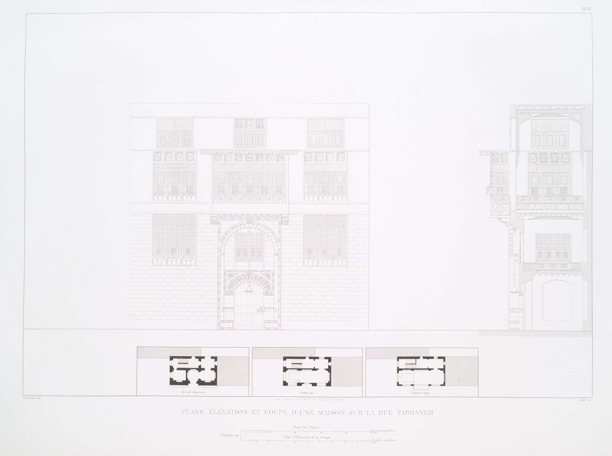 Pascal Coste’s plates are based on the extensive documentation he made in Cairo between 1818 and 1827. The elevation and the section of this house in ‘rue Tabhaneh’ show four mashrabiyyāt with stucco and glass windows. Coste’s book is the first to illustrate stucco and glass windows in detail. The symmetrical distribution of the various motives is reproduced. However, in the elevation of the house in ‘rue Tabhaneh’, the design of the windows is rendered very schematically. One of Coste’s drawings, made in Cairo, shows the served as basis for the plate (Marseille, Bibliothèque de l’Alcazar, MS1310_f73a). The window openings are labelled “vitraux” and some are sketched with slightly more detail than in the plate. It is furthermore specified that the house in Tabhaneh street belongs to Hamed Kaÿa Pozas.