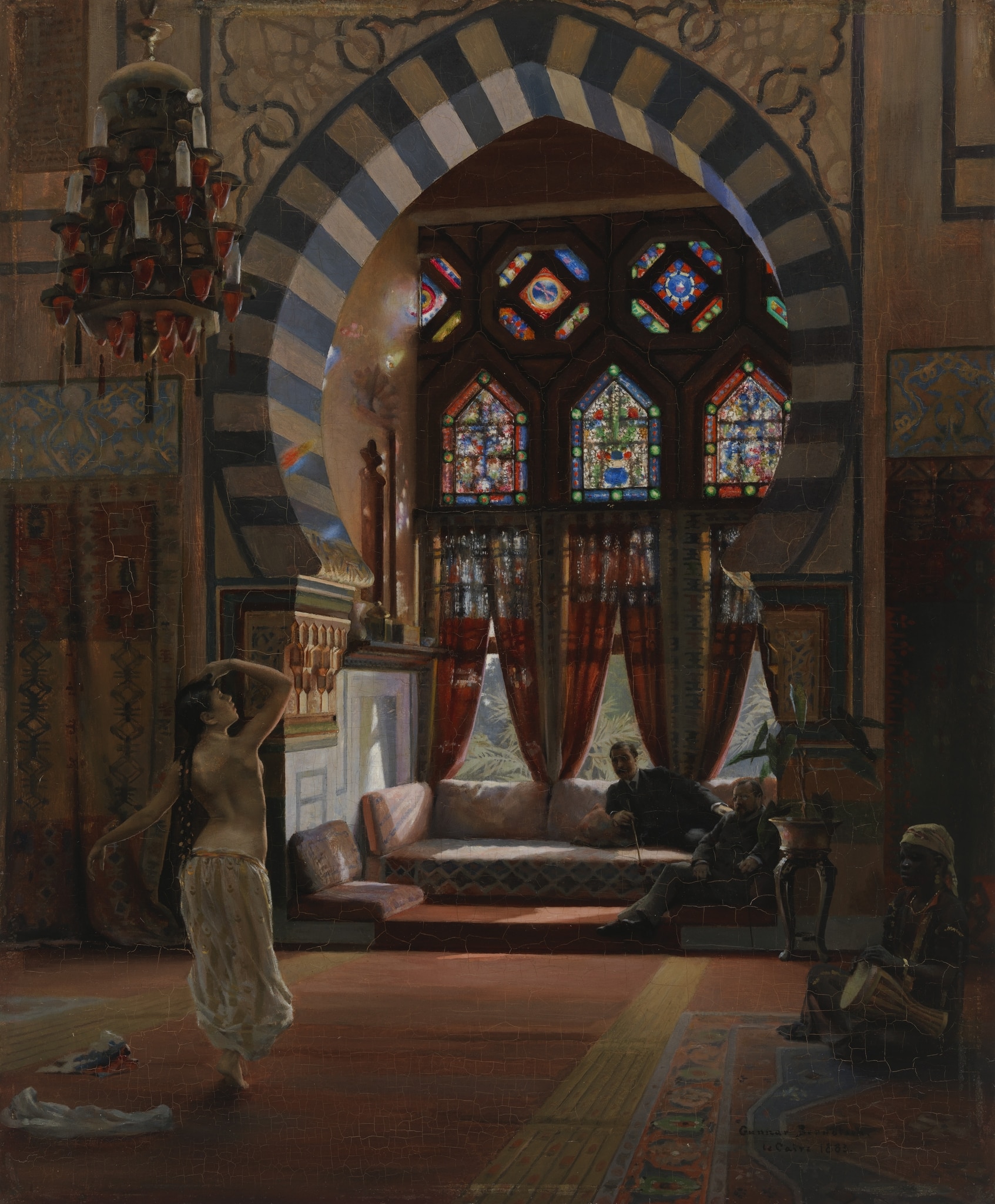 This oil painting by the Finnish painter Gunnar Berndtson (1854–1895) shows a performance by a female dancer in an interior in Egypt. The woman, whose upper body is naked, dances in the foreground before a male audience. Two men in European costume linger in a window recess and watch. The female protagonist is accompanied by a female drummer on the right-hand side of the painting.