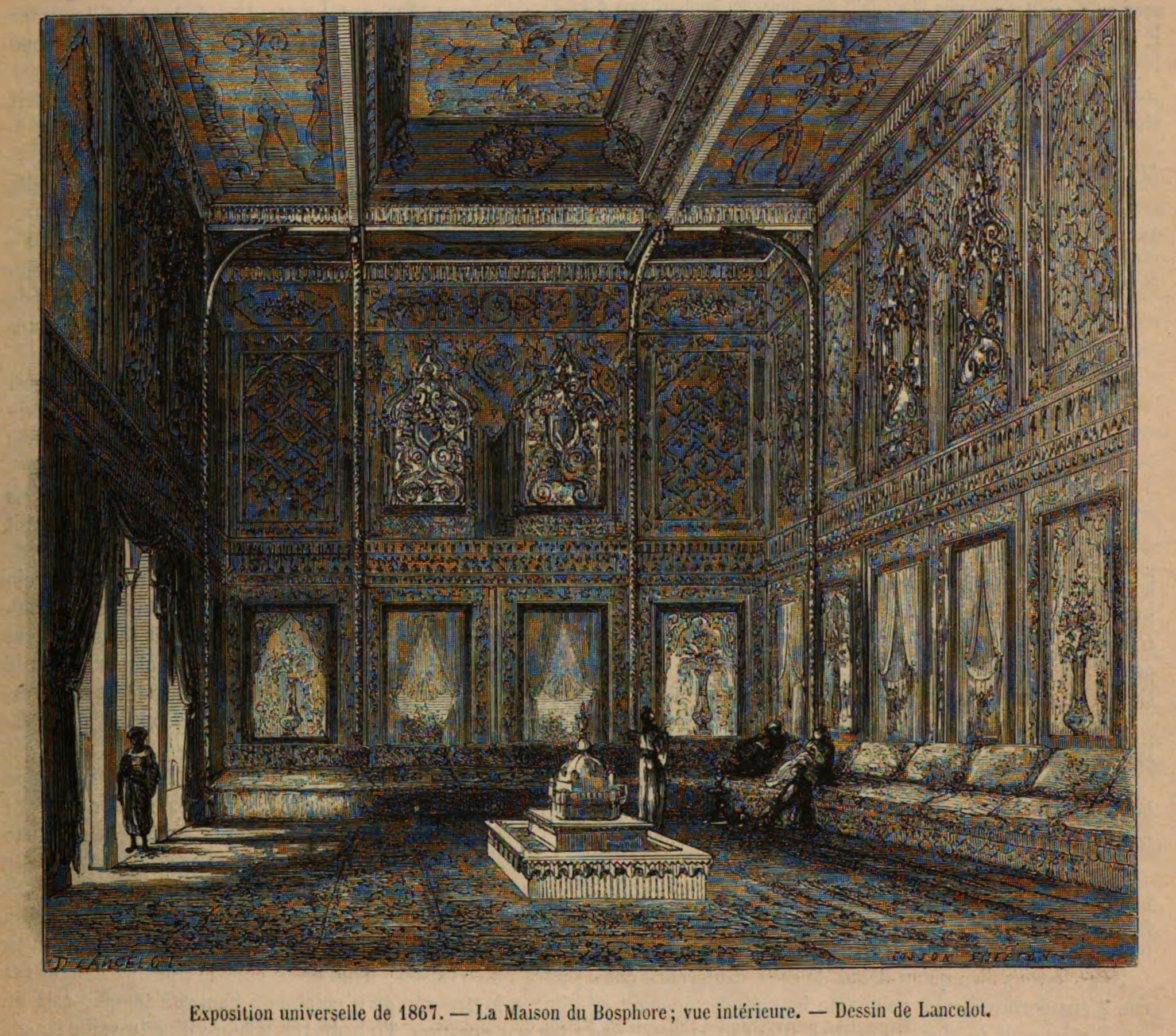 This illustration shows the interior architecture Pavillon du Bosphore in a very stylized and simplified way, such that the materials of the interior decoration are unclear. But bearing in mind other information on the Pavillon du Bosphore (IG_398), as well as the text accompanying the illustration, one can identify the upper wall panels as stucco and glass windows. According to the newspaper article, the windows, which looked dull from the outside, but sparkled on the inside, and were of a more muted brilliance than the windows of Western cathedrals. The technique is compared with that of Western stained glass windows: instead of being set in a thin lead network, the coloured glass was set in a thick plaster lattice to reflect and soften the light by casting a shadow. (‘Les fenêtres de la galerie supérieure, d’un aspect si morne quand on les regardait du dehors, brillaient à l’intérieur comme nos verrières de cathédrales, avec un éclat plus voilé pourtant ; car les vitraux, au lieu d’être sertis dans un mince réseau de plomb, s’enchâssaient profondément dans une épaisse armature de plâtre dont la paroi reflétait et adoucissait la lumière, et dont l’ombre portée divisait et atténuait l’éclat de la verrière.’; La Maison Du Bosphore, 1867, p. 389).