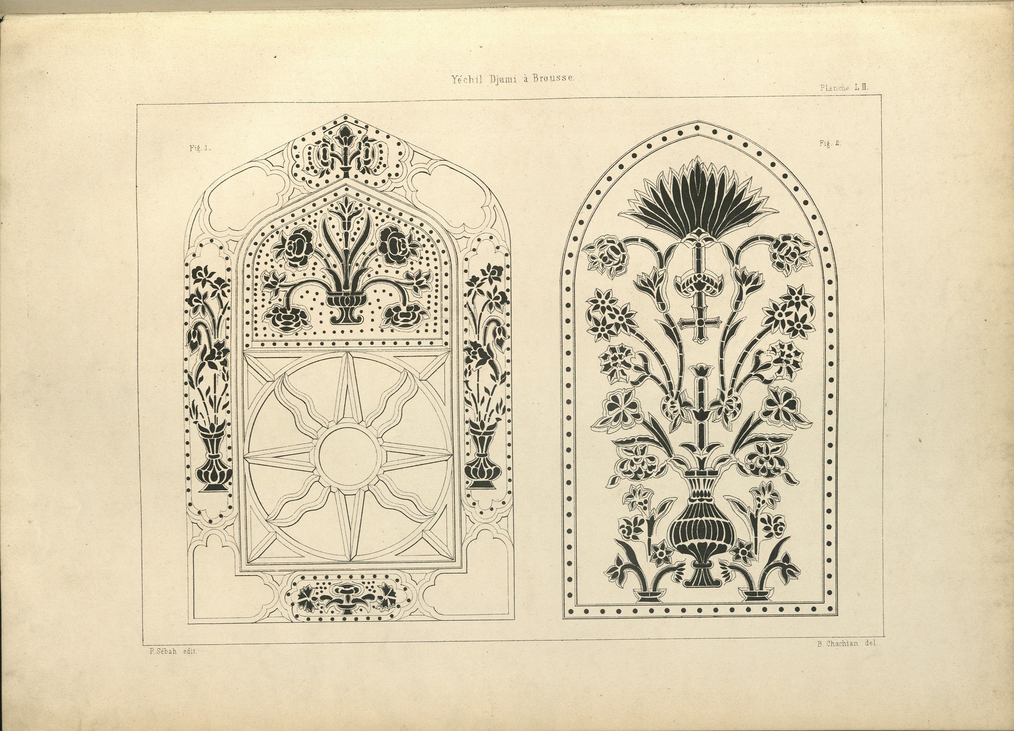 Ill. LII, figs 1, 2, in Marie de Launay, Die Ottomanische Baukunst / L’Architecture ottomane / Uṣūl-i Miʿmāriyye-i ʿUsmaniyye, Istanbul: Imprimerie et lithographie centrales (1873) shows two stucco and glass windows in black and white based on a drawing by Bogos Şaşiyan.