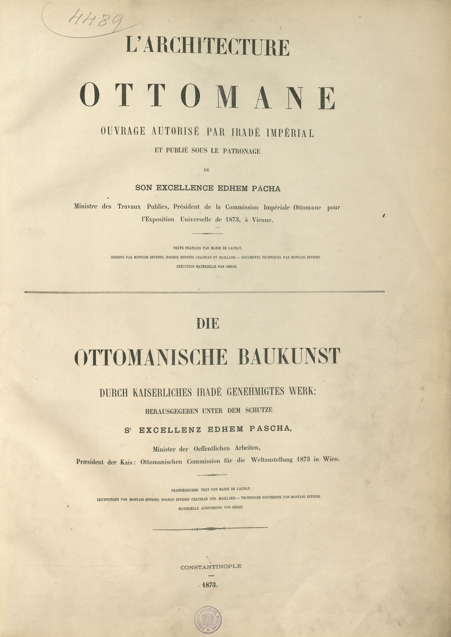 Launay, M. De, 1873. Die Ottomanische Baukunst / L’Architecture ottomane / Uṣūl-i Miʿmāriyye-i ʿUsmaniyye, Istanbul: Imprimerie et lithographie centrales.