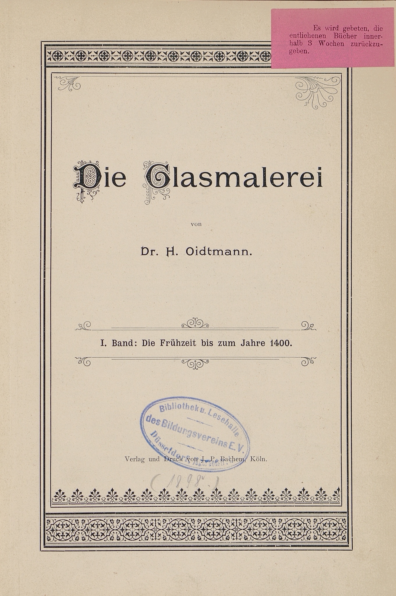 Volume 2 of Heinrich Oidtmann’s Die Glasmalerei. Allgemein verständlich dargestellt, published in 1898, is the first publication on stained glass in German language that mentions Islamic stucco and glass windows. Oidtmann’s description is entirely based on the publications of William Burges of 1858 (see IG_189, translated and published in the Organ für christliche Kunst that year) and those of Édouard Didron dating to 1863 (see IG_246).