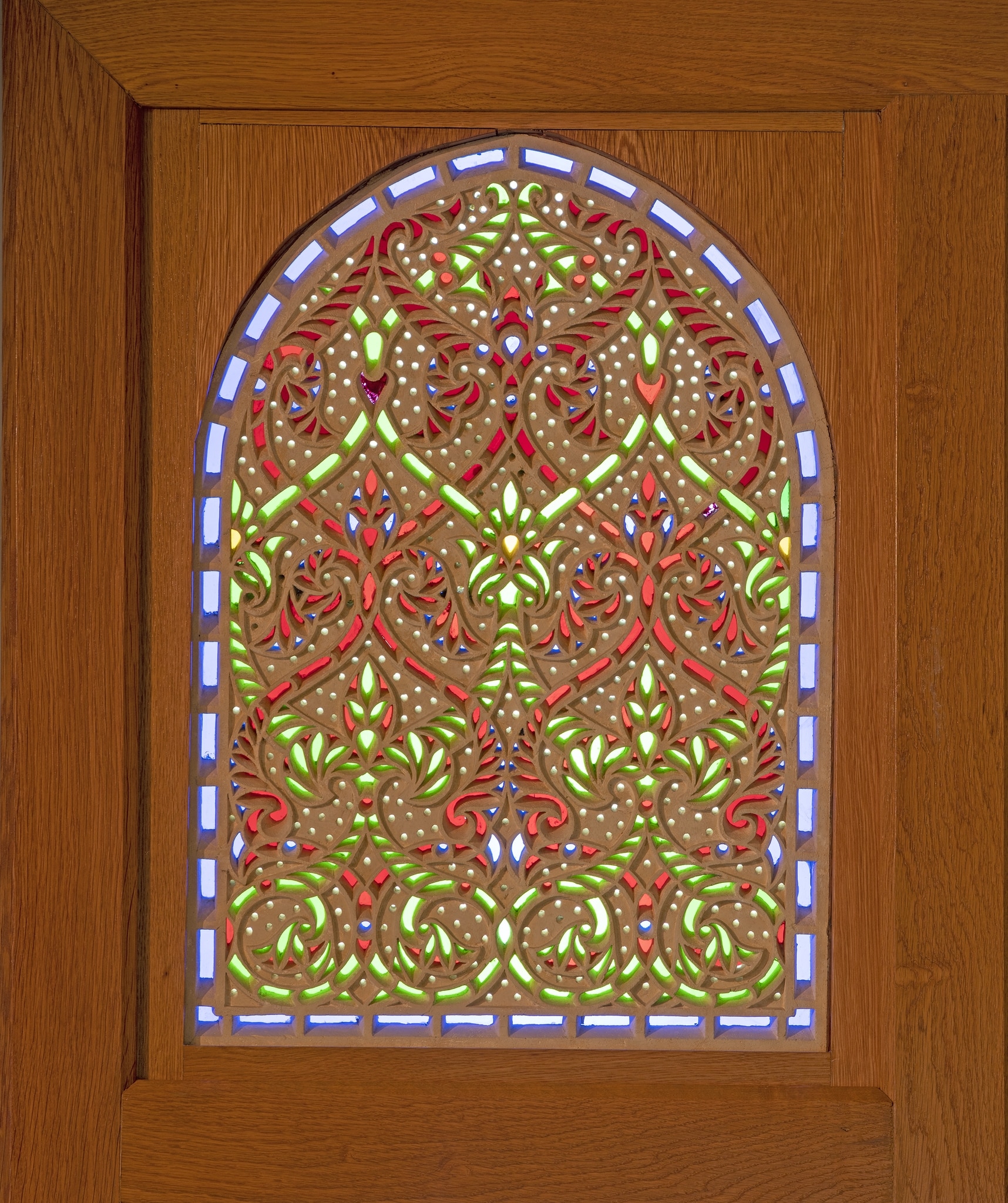 Latticework carved into a rectangular stucco panel and inlaid with colourless and coloured sheet glass. The pieces of glass are fixed on the back of the lattice with a thin layer of gypsum plaster. The average thickness of the stucco panel is 19–20mm. The stucco panel was cast in a wooden frame.