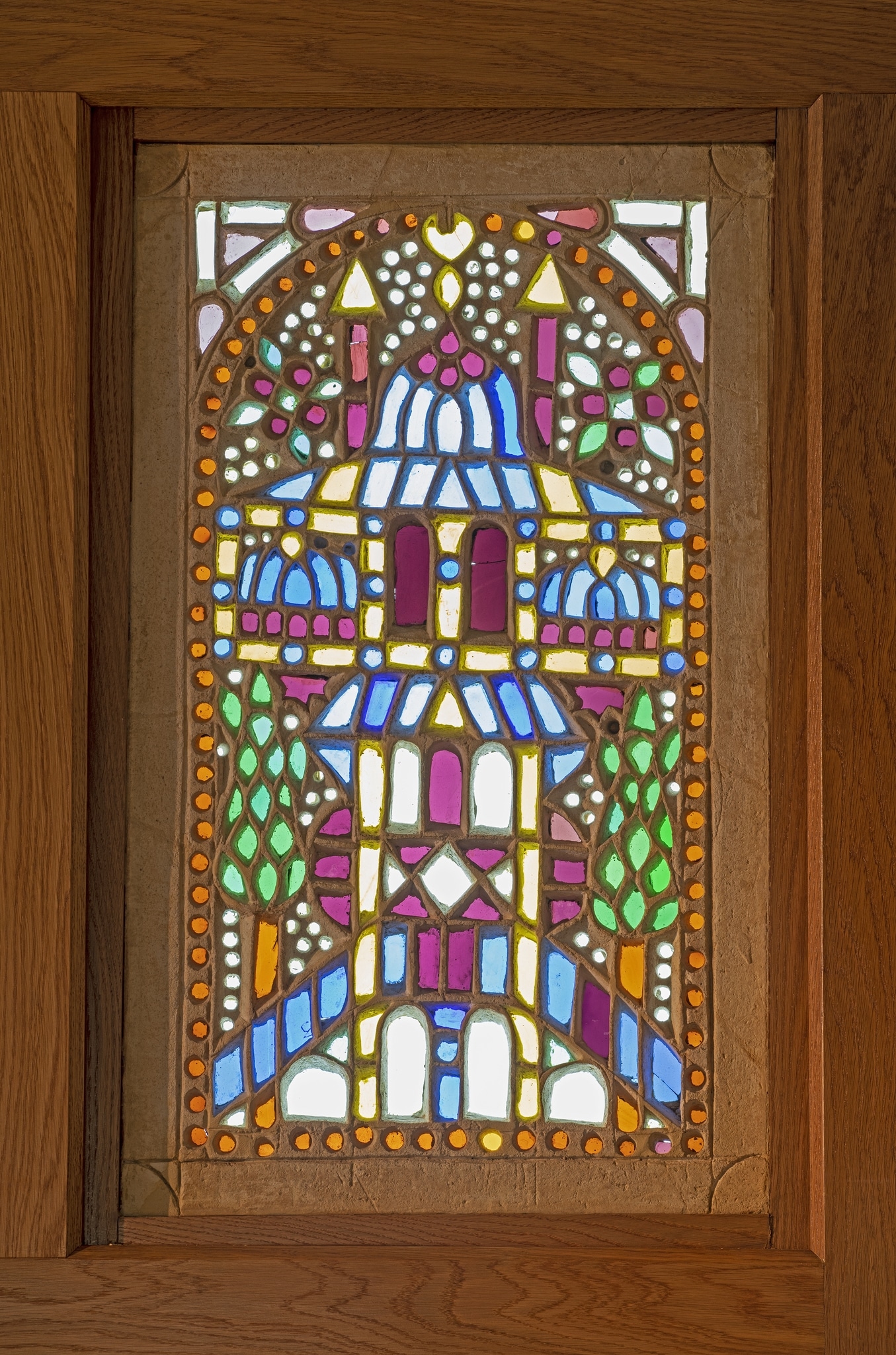 Rectangular stucco and glass window with a representation of an Ottoman mosque. The building is depicted in a reduced way, highlighting the shrine’s main features, i.e., the courtyard, the prayer hall with a central dome crowned by a jamur ending in a crescent moon, and two thin minarets with pointed roofs. Two smaller domes are placed on either side of the main one. As is usual in comparable representations in other media, such as ceramics, the mosque is depicted by combining a front view (prayer hall) and a bird’s eye view (courtyard). Two cypress trees and two blossoming flowers flank the mosque. The whole motif is worked out in relief against a perforated background that lies 6–8mm below the surface of the stucco panel. It is surrounded by a dotted, semicircular frame. The spandrels above the arch show a geometric ornamentation.