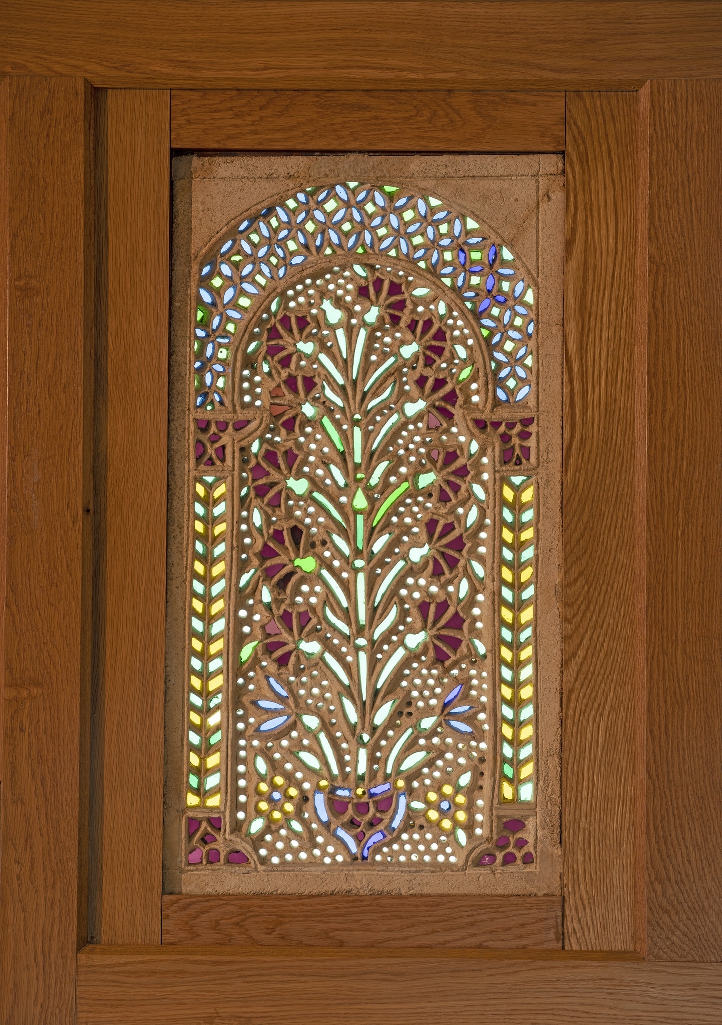Latticework carved into a rectangular stucco panel and inlaid with colourless and coloured sheet glass. The pieces of glass are fixed on the back of the lattice with a thin layer of gypsum plaster. The average thickness of the stucco panel is approximately 27mm. The stucco panel was cast in a wooden frame.