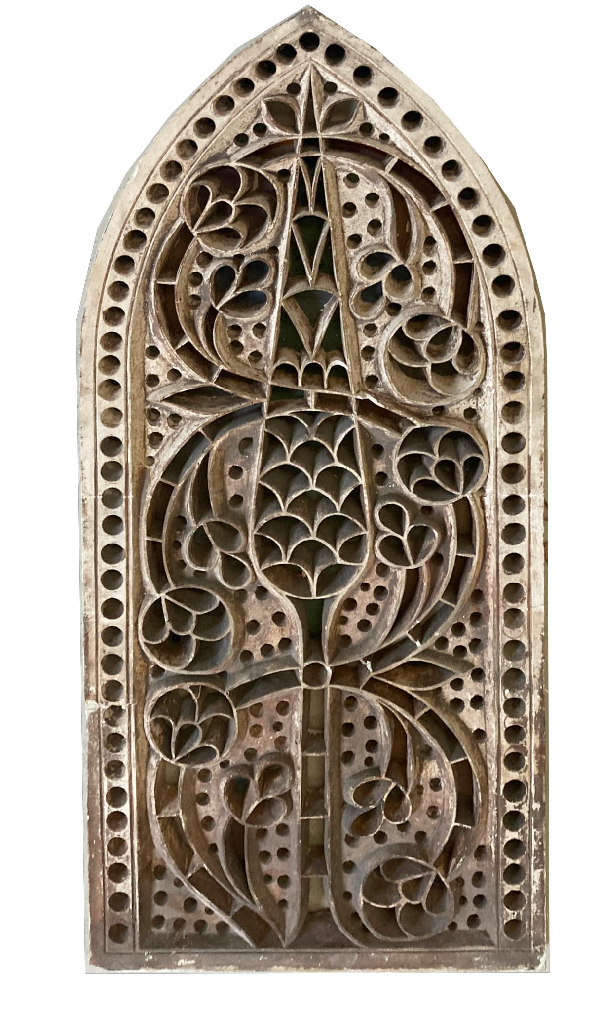 Pointed-arch stucco and glass window with a green cypress tree in the centre, surrounded by an S-shaped winding flower tendril with stylized roses and three-petalled flowers. The scale-like pattern usually used to represent the foliage of the cypress is replaced in the upper part by geometric ornament, and the top of the tree is flanked by two leaves. The cypress tree and tendril are framed by a pointed arch and surrounded by a perforated background, which is slightly recessed.