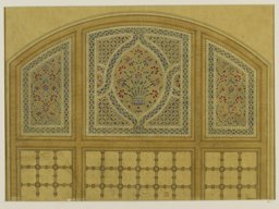 This design by the British architect James William Wild (1814–1892) served as a model for the production of a stucco and glass window in ‘Arab style’ for the Oriental Courts of the South Kensington Museum in London. The London-based firm James Powell & Sons executed the window after Wild’s draft. Records indicate that Wild was not paid for his Oriental Court Arab window until eleven years after the original commission (Physick, 1982, p. 82; Thomas, 2013, pp. 54–56; Giese, 2021, p. 97).