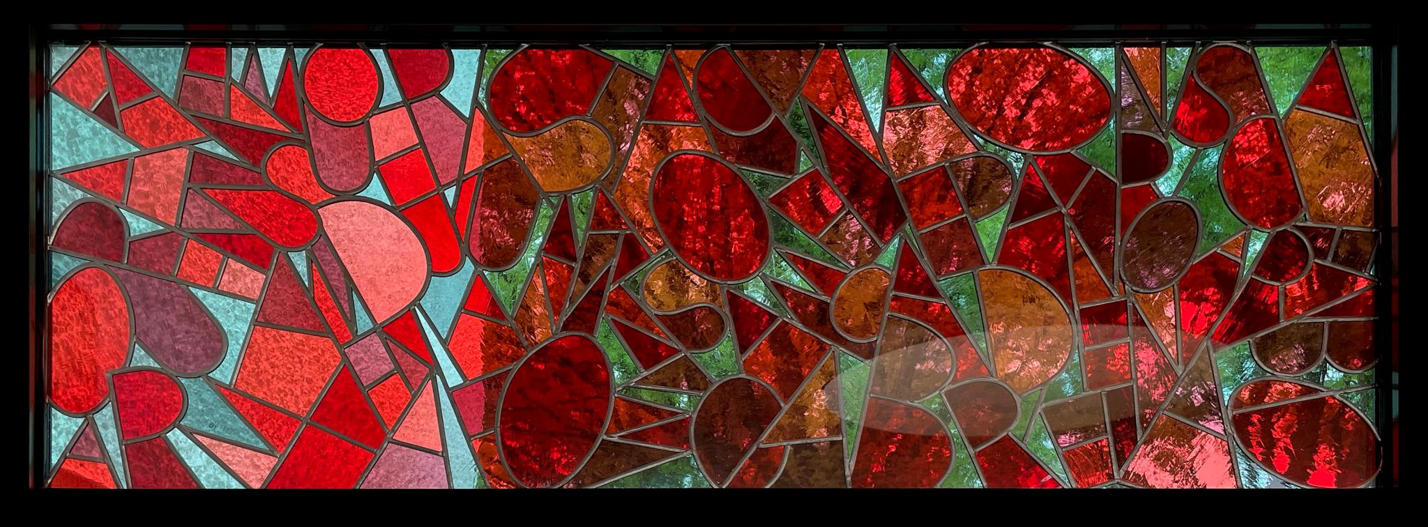 Rechteckiges Glasgemälde mit Ornament aus Buchstaben. Grundfarbe Rot.