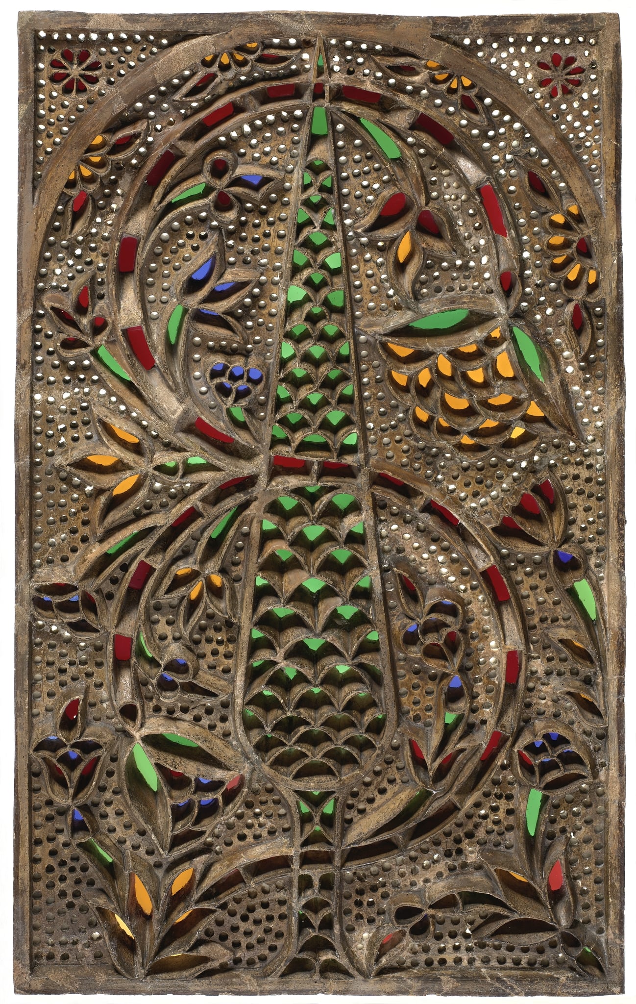 From a technical and iconographic point of view, this stucco and glass window corresponds to one of the standard types of qamariyya widespread in Egypt during the Ottoman period. Similar windows can be found in several of the collections studied (see for instance IG_18, IG_173, IG_355). The representation of a cypress tree surrounded by a flower tendril is a widespread motif in Islamic arts. It can also be found in numerous other media, such as ceramics, wood panelling, wall paintings, and textiles, over a long period of time, and in both sacred and profane contexts.