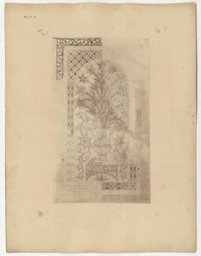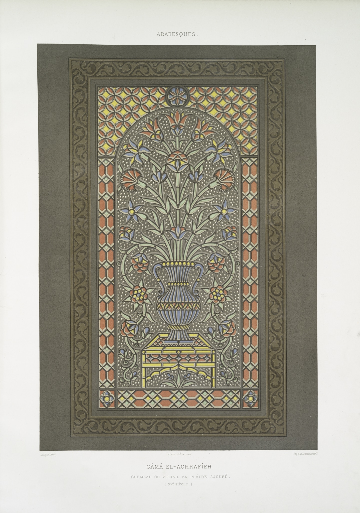 Pl. CXLV in vol. 3 of Émile Prisse d’Avennes’ L’Art arabe d’après les monuments du Kaire depuis le VIIe siècle jusqu’à la fin du XVIIIe, 1877. The plate shows a single stucco and glass window with flowers in a vase. The vase stands on a pedestal under a round arch. The bouquet consists of different flowers, among them lillies, carnations, roses, and tulips. The background is perforated. A red interlaced frame encloses the bouquet, and latticework fills the spandrels on both sides of a flower in the apex.