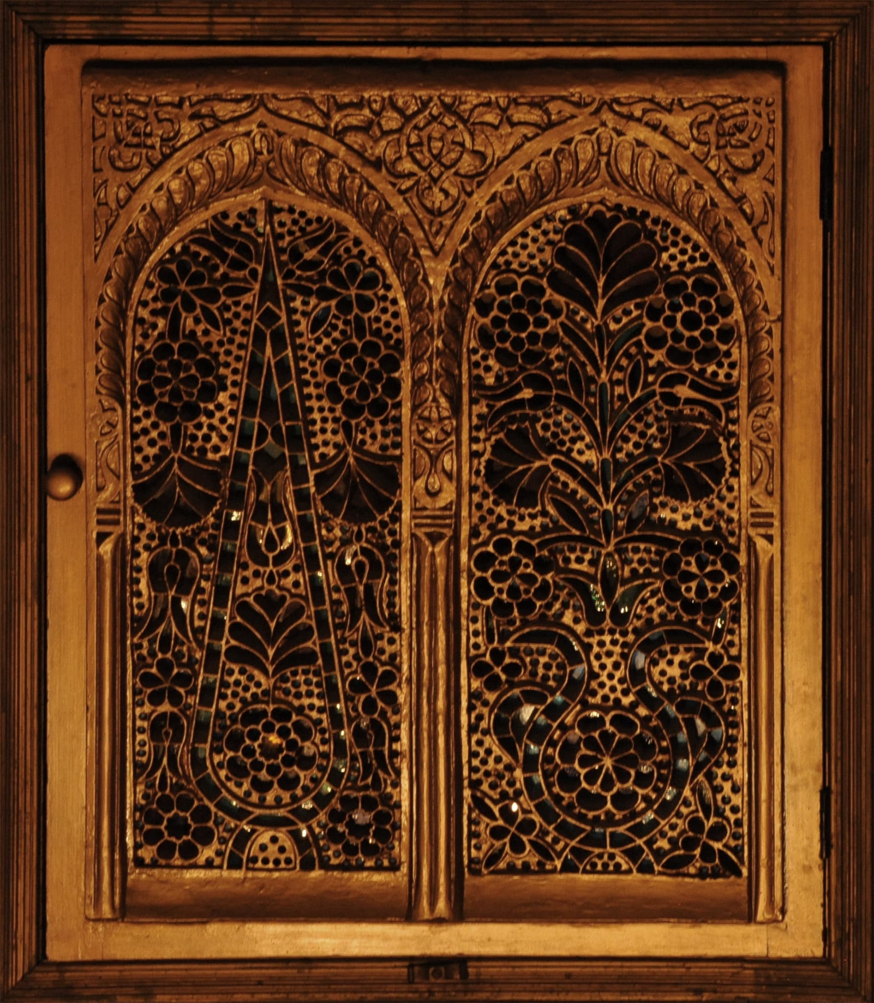 From an iconographic point of view, this replica juxtaposes two of the most popular motifs of Islamic stucco and glass windows during the Ottoman period: the cypress tree and flowers in a vase. Both motifs are widespread in Islamic decorative arts and can be found in numerous other media, such as ceramics, wood panelling, wall paintings, and textiles, over a long period of time, and in both sacred and profane contexts.