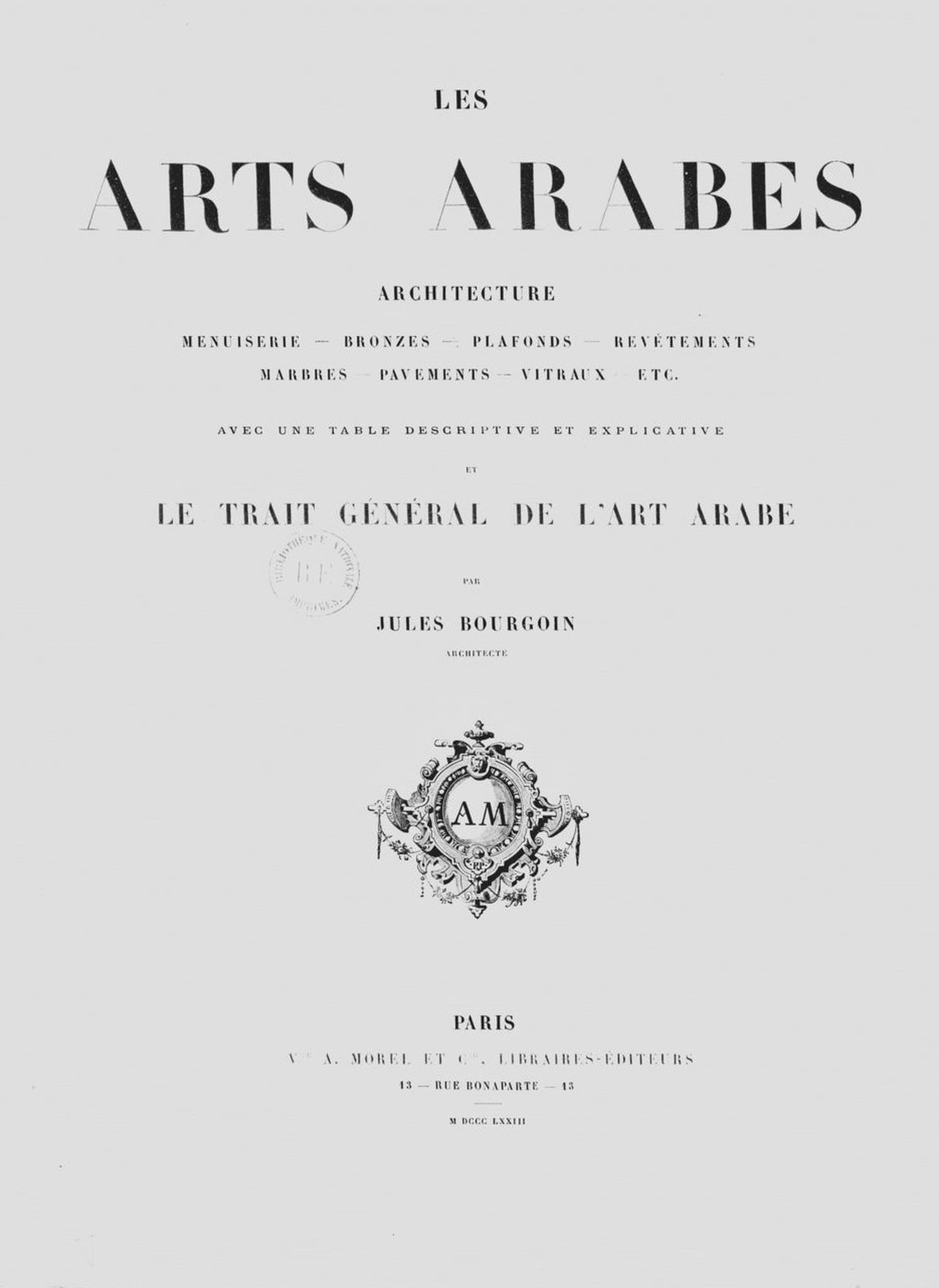 Bideault, M. (2012). Les Arts arabes ([1868]-1873) In Jules Bourgoin (1838-1908) : L’obsession du trait [en ligne]. Paris: Publications de l’Institut national d’histoire de l’art. Retrieved from https://books.openedition.org/inha/4586.