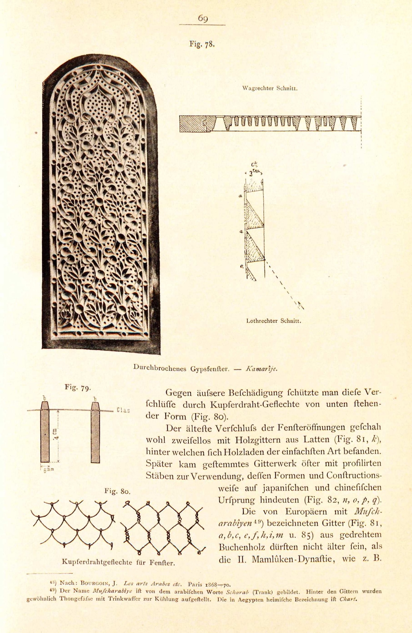 This page in Julius Franz’ second edition of Die Baukunst des Islam shows four illustrations, two already known from the first edition. A new technical drawing (fig. 79) demonstrates how the pieces of coloured glass were attached by means of ‘Gypswürstchen’ (strips of plaster, marked with a ‘b’) on the reverse of the stucco plate (Franz, 1896, pp. 67–68). This method was also described by Max Herz (1895, p. 8; see IG_160), shortly before the publication of the second edition, as the older of two techniques for the production of stucco and glass windows.