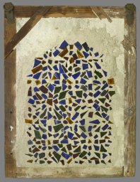 Coarse-grained gypsum plaster; coloured glass (two shades of green, two shades of blue, two shades of yellow, purple, and red flashed glass); wood; metal; blue paint