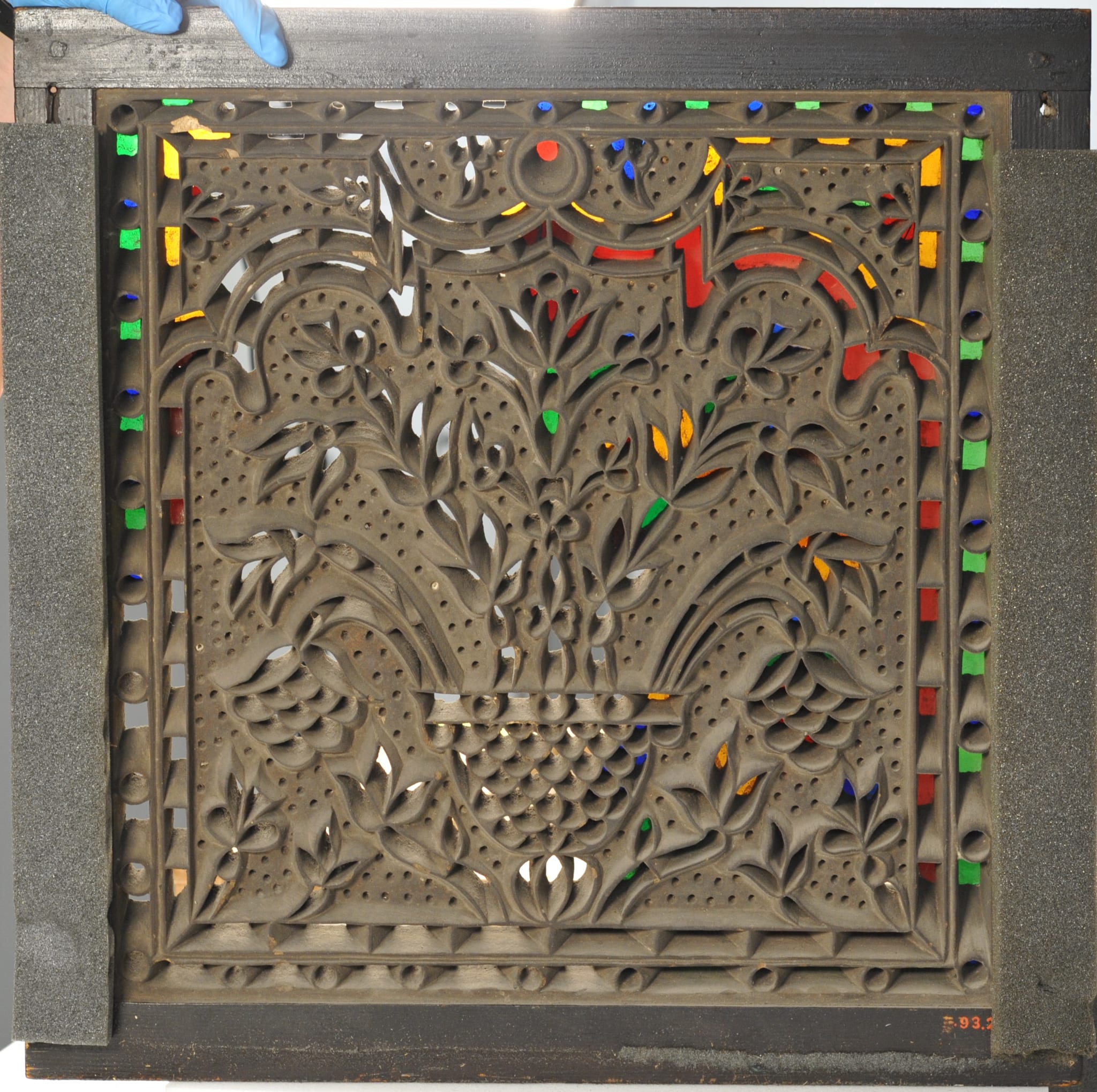 The latticework was carved into a rectangular stucco panel and inlaid with colourless and coloured sheet glass. The pieces of glass are fixed onto the back of the lattice with a thin layer (2–3mm) of gypsum plaster. To prevent the pieces of glass from being displaced while pouring the embedding stucco, some of the pieces seem to have been fixed to the latticework with an adhesive. In some places, traces of this animal or vegetable glue are visible in the area around the openings. The thickness of the stucco panel is 20–23mm. The stucco panel was cast in a wooden frame measuring 40 × 40 × 25mm. The frame is stained dark brown.