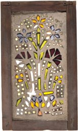 This stucco and glass window is preserved in its original frame. Apart from notable damage in the perforated background above the vase and a large crack in the top left area of the panel, the latticework only shows minor superficial losses. Several pieces of glass are missing (c.10%). Three pieces of glass show traces of paint.