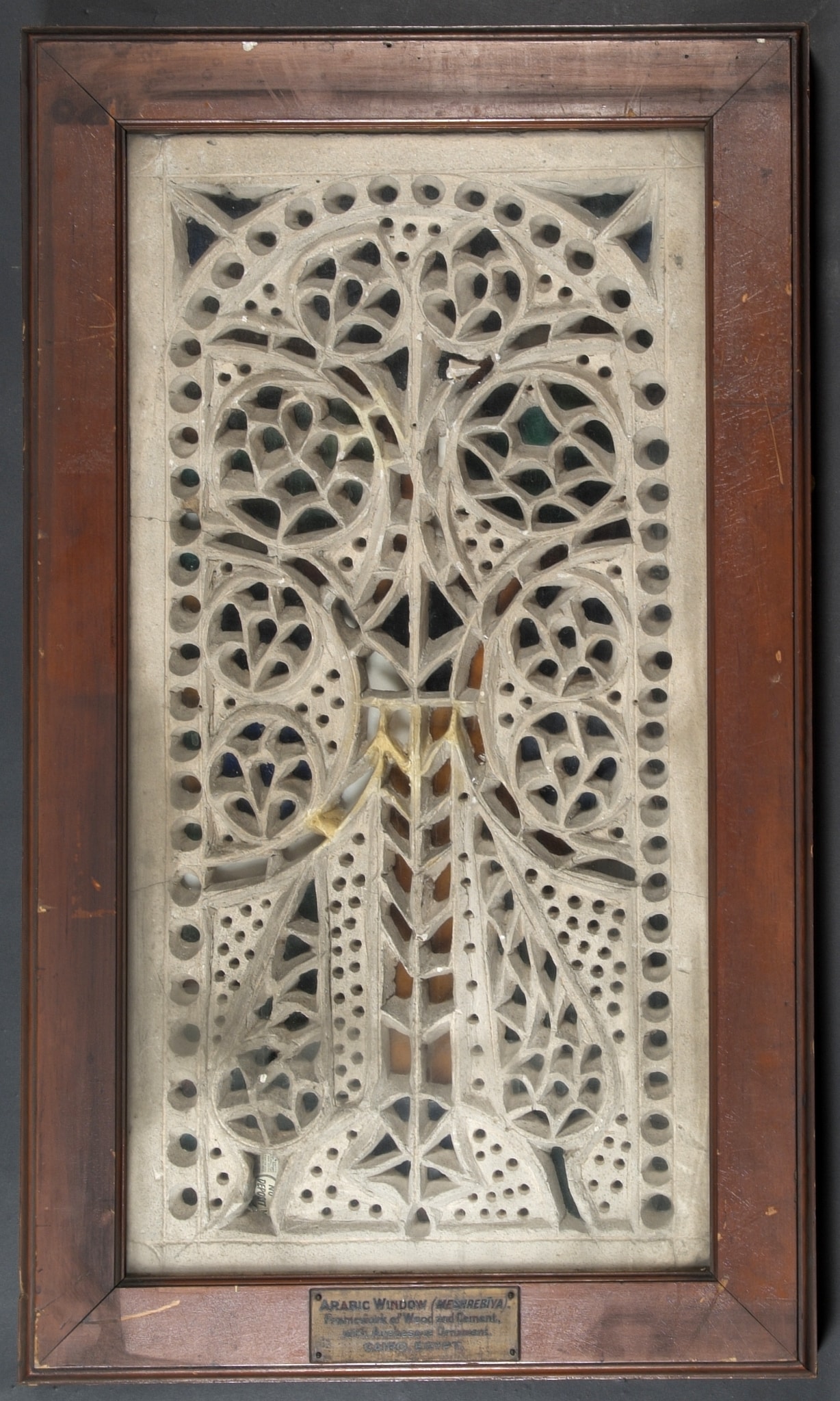 Latticework carved into a rectangular stucco panel and inlaid with colourless and coloured sheet glass. The pieces of glass are fixed on the back of the lattice with a thin layer of gypsum plaster. This layer is 1mm thick. The average thickness of the stucco panel is 25mm. The stucco panel was cast in a wooden frame measuring c.55 × 55 × 35mm. The frame is stained dark brown.
