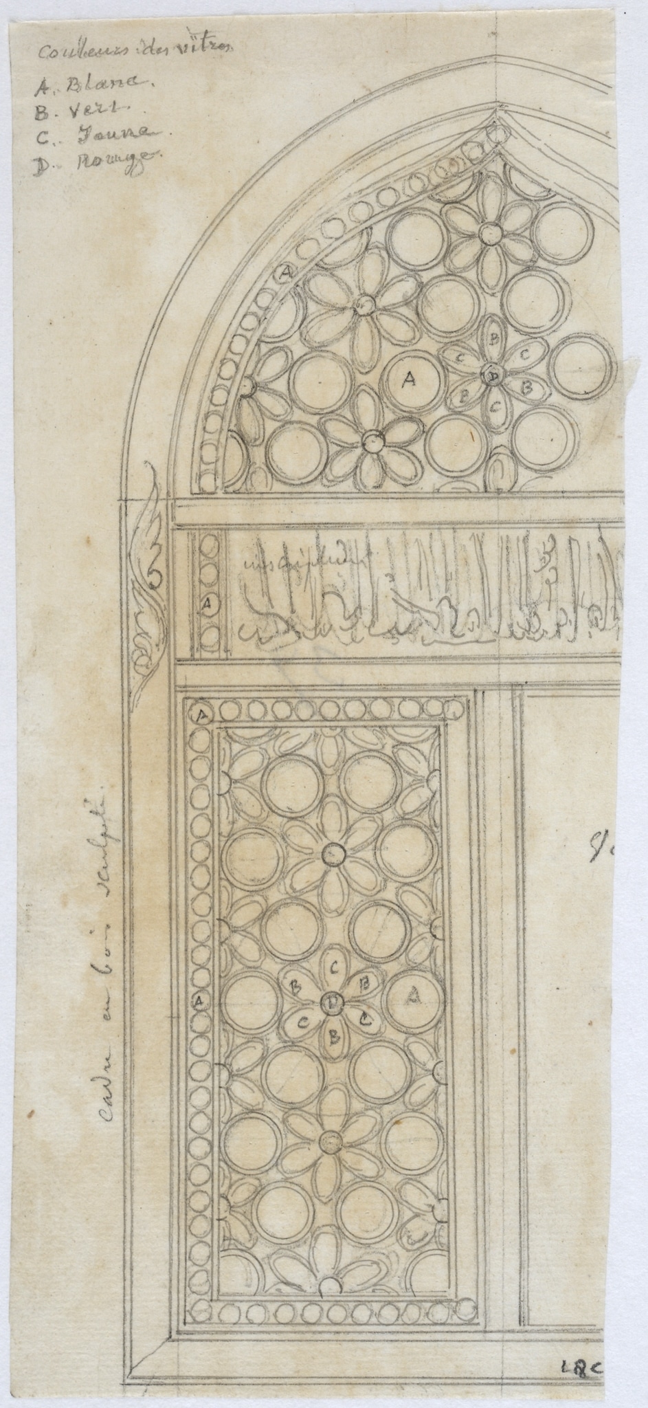 Between 1818 and 1827, Pascal Coste documented the buildings in Cairo extensively, among them the Sultan Hasan Mosque (757–764 AH / 1356–1363 CE). Two preparatory works for his publication Architecture arabe, ou Monuments du Kaire, Mesurés et Dessinés, de 1818 à 1826 (1837) are dedicated to the windows of this mausoleum (see IG_202). The present one shows the pointed mullioned window and has indications for the colours of the pieces of glass: white (blank), green, yellow, and red. A second drawing shows the circular window of the qibla wall (IG_295).