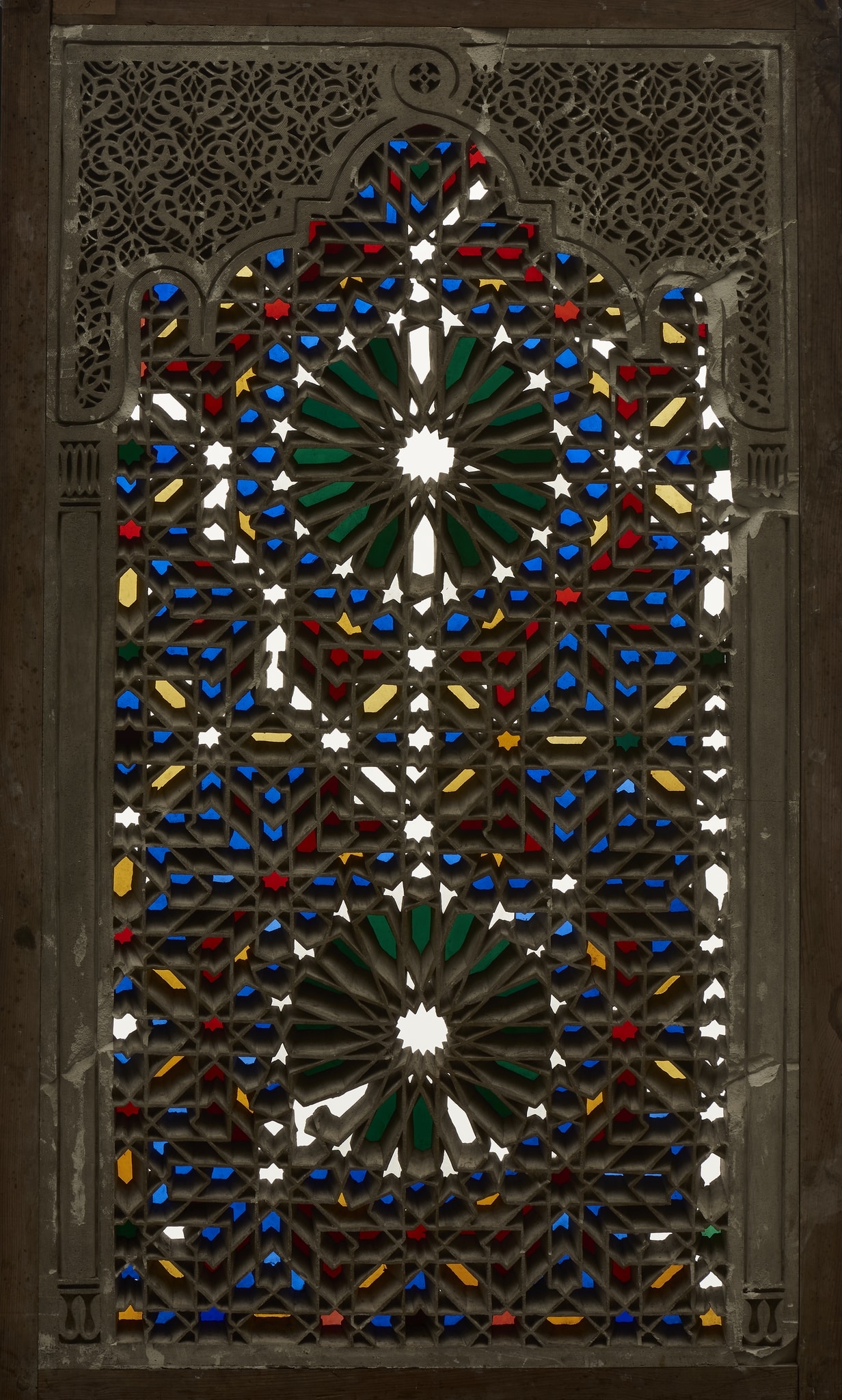 Rectangular stucco and glass window with geometric ornamentation composed of regularly placed eight- and sixteen-pointed stars. The stars form an interlaced grid. The main field is framed by a lambrequin arch ending in a knot at its apex and supported by two columns. The spandrels above the arch are filled with a continuous floral ornament composed of stylized split palmettes. The columns, the arch, and the spandrels are – unlike the star pattern – not perforated and therefore not backed with coloured glass.