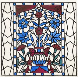 The motif is painted on the front of the glass. Black grisaille (or enamel) was used for the contour lines, red and blue enamel for the flower and the vase. To achieve the green in the leaves of the carnations, silver stain (applied on the back) has been combined with blue (applied on the front). Silver stain – again applied on the back – has also been used to enhance the colour of the red enamel.