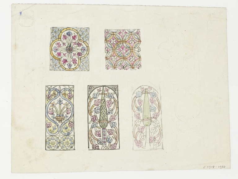 This pencil and watercolour drawing by the British architect James William Wild (1814–1892) shows seven stucco and glass windows. Four rectangular windows can be seen in the lower row and three square windows in the upper. Only five of the seven windows are completely drawn and coloured. The two windows on the right-hand side were only sketched in fine pencil outlines as their motifs are the mirror image of those on the left-hand side.