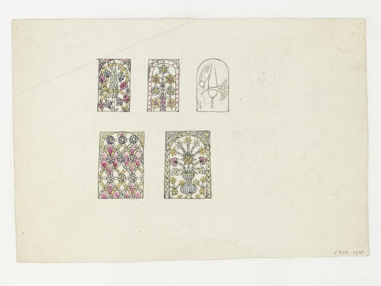 This pencil and watercolour drawing by the British architect James William Wild (1814–1892) shows seven rectangular stucco and glass windows in two rows; only four of the windows were executed in colour.