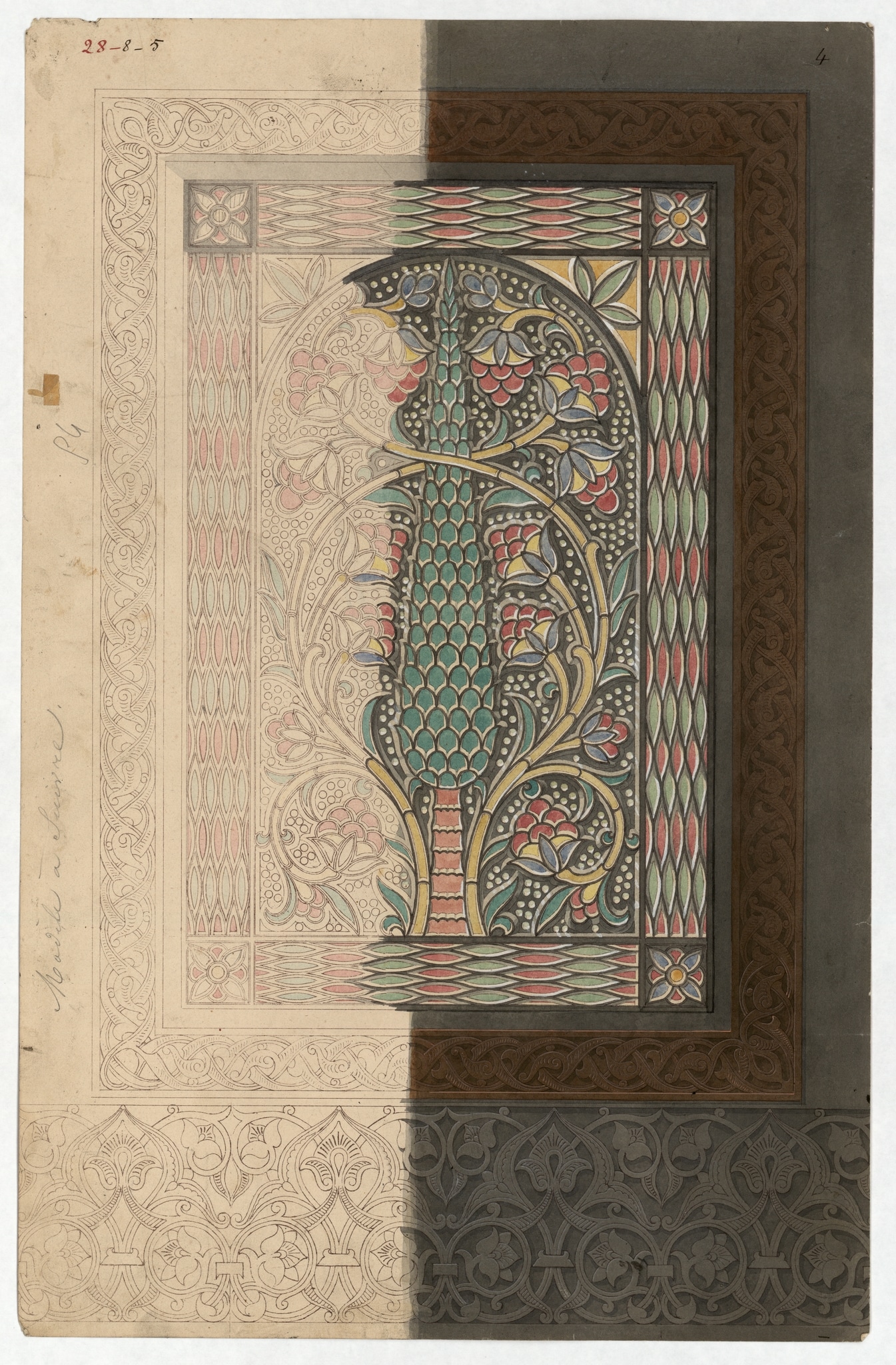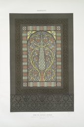 This lithograph, made by Émile Prisse d’Avennes (1807–1879), shows a rectangular stucco and glass window with the motif of a stylized cypress tree entwined by a yellow tendril with red blossoms, within an arch. The holes drilled in the stucco are indicated with many small dots. The arched frame consists of geometric forms made of pieces of red and green glass. Stylized blossoms can be seen in the four corners of the rectangular frame. The stucco and glass window is encased in a wooden frame with interlace ornament. Prisse d’Avennes drew the entire window in a fine pencil drawing, but concentrated mainly on the right-hand side of the symmetrical window when colouring it. There is an annotation on the left side which says “Modèle à suivre” (template to follow).