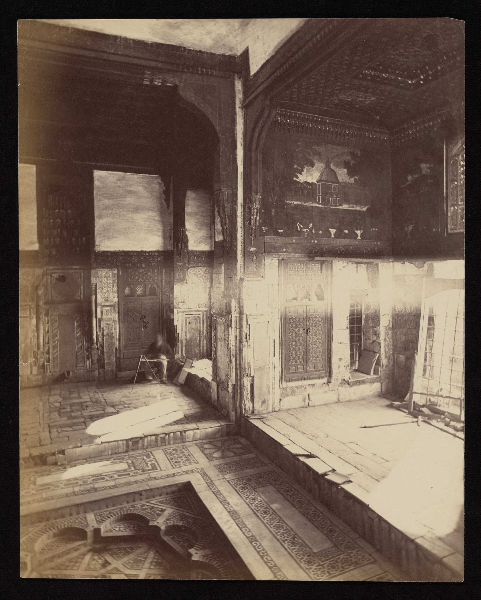 This interior is the mandarah of the ‘House of the Mufti’ in Cairo – so named because it was owned by the supreme mufti of Egypt, Sheikh Muhammad al-ʿAbbasi al-Mahdi (1827–1897) between 1847 and 1886 (Llewellyn, 1998, p. 154). During the 19th century, Europeans had become familiar with the term mandarah through Edward William Lane: ‘In general, there is, on the ground-floor, an apartment called a mun’dar’ah, in which male visitors are received’ (Lane, 1836, p. 11). According to Mercedes Volait, the ‘House of the Mufti’ was built at the beginning of the 18th century, between 1704 and 1705 (a date that can be found on a column in the residence) and had been given to Sheikh al-ʿAbbasi when he became Grand Mufti in 1848 (Volait, 2021).