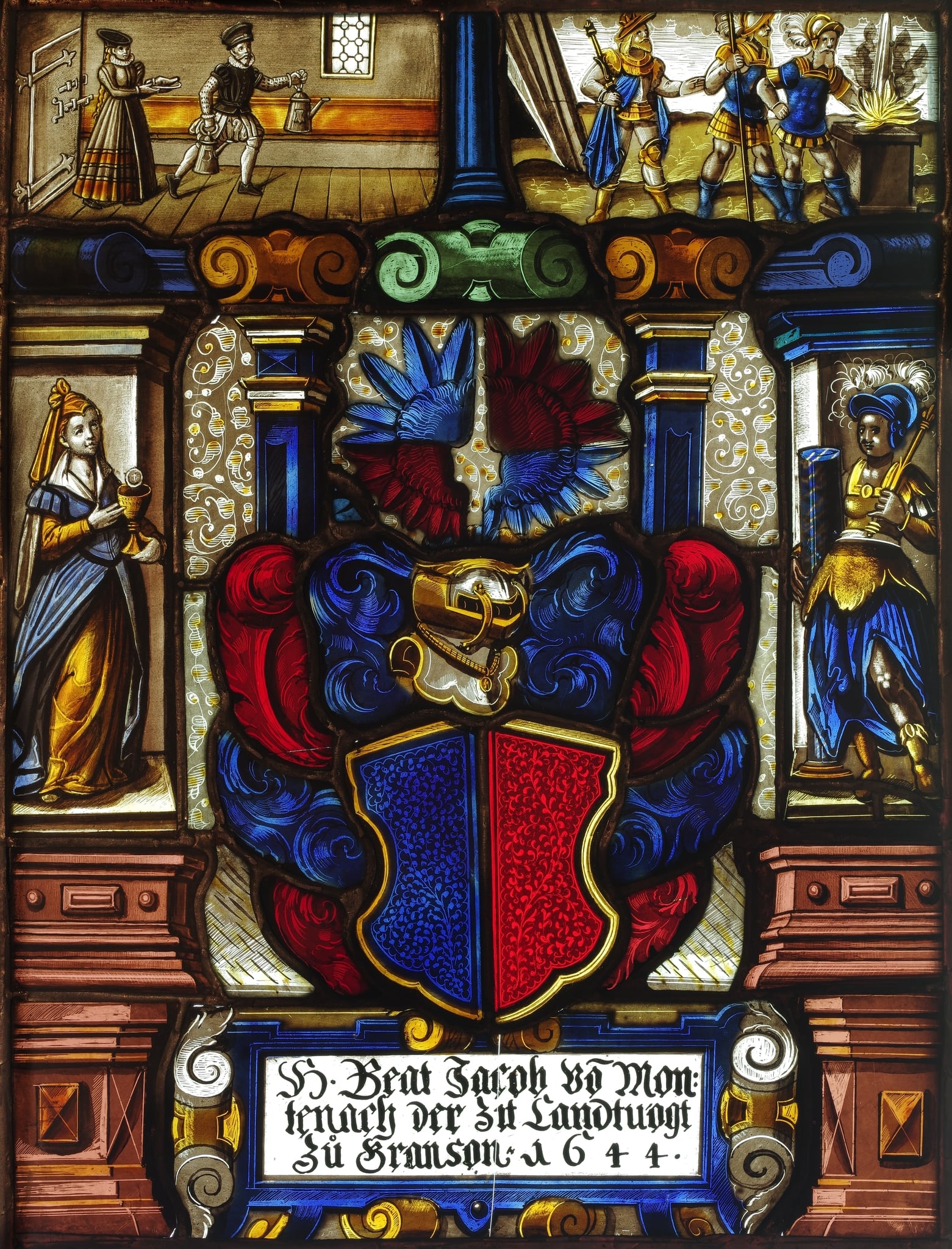Ce panneau a été commandé en 1644 par le Fribourgeois Beat Jacob von Montenach (1593-1663) alors qu’il était bailli de Grandson, fonction qu’il a occupée de 1640 à 1645 (DHBS, 1928, p. 790). Le vitrail possède un pendant aux armes de Johann Heinrich Wild (GE_2005), également conservé dans la collection du Musée Ariana de Genève.