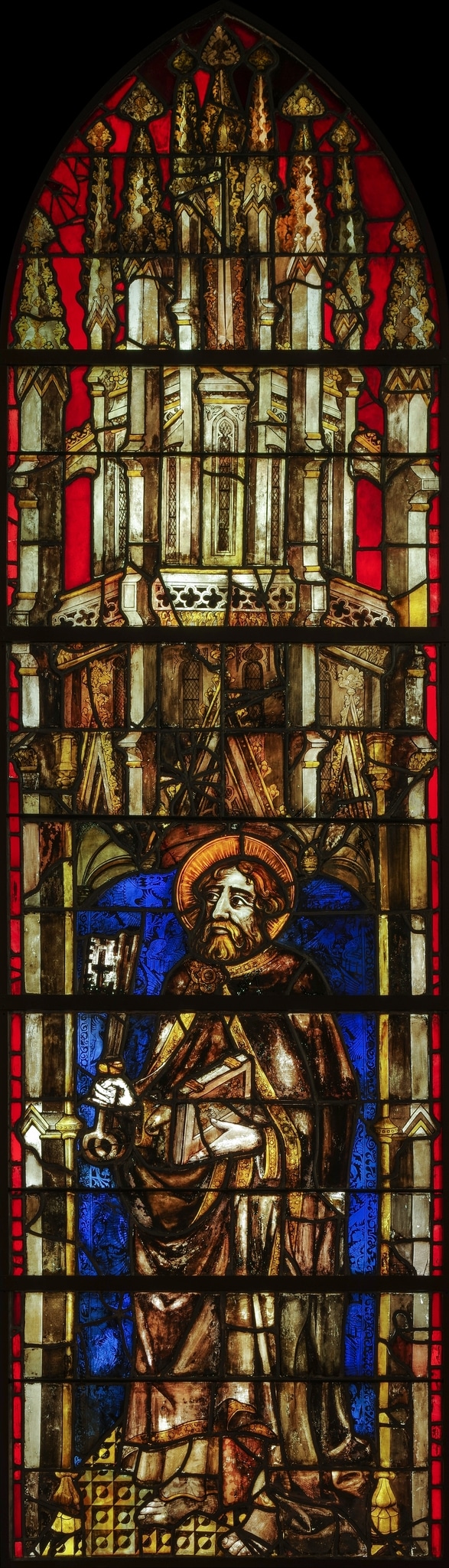 Le style de la baie de saint Pierre permet de la dater vers le milieu du XVe siècle, ce qui en fait la plus ancienne du groupe. A cette époque, deux peintres verriers importants exercent leur activité à Genève et dans ses environs : Guillaume Coquin et Janin Loysel (Lapaire, 2008, p. 19 ; Aballéa, 2020, p. 54). Ce dernier, actif à Genève dès 1415, semble être l’auteur du présent vitrail compte tenu qu’il est en charge des vitraux de Saint-Pierre dès 1419 et qu’il a réalisé de nombreuses commandes prestigieuses, notamment pour la maison de Savoie (Lapaire, 2008, p. 19 ; Aballéa, 2020, p. 53-54).