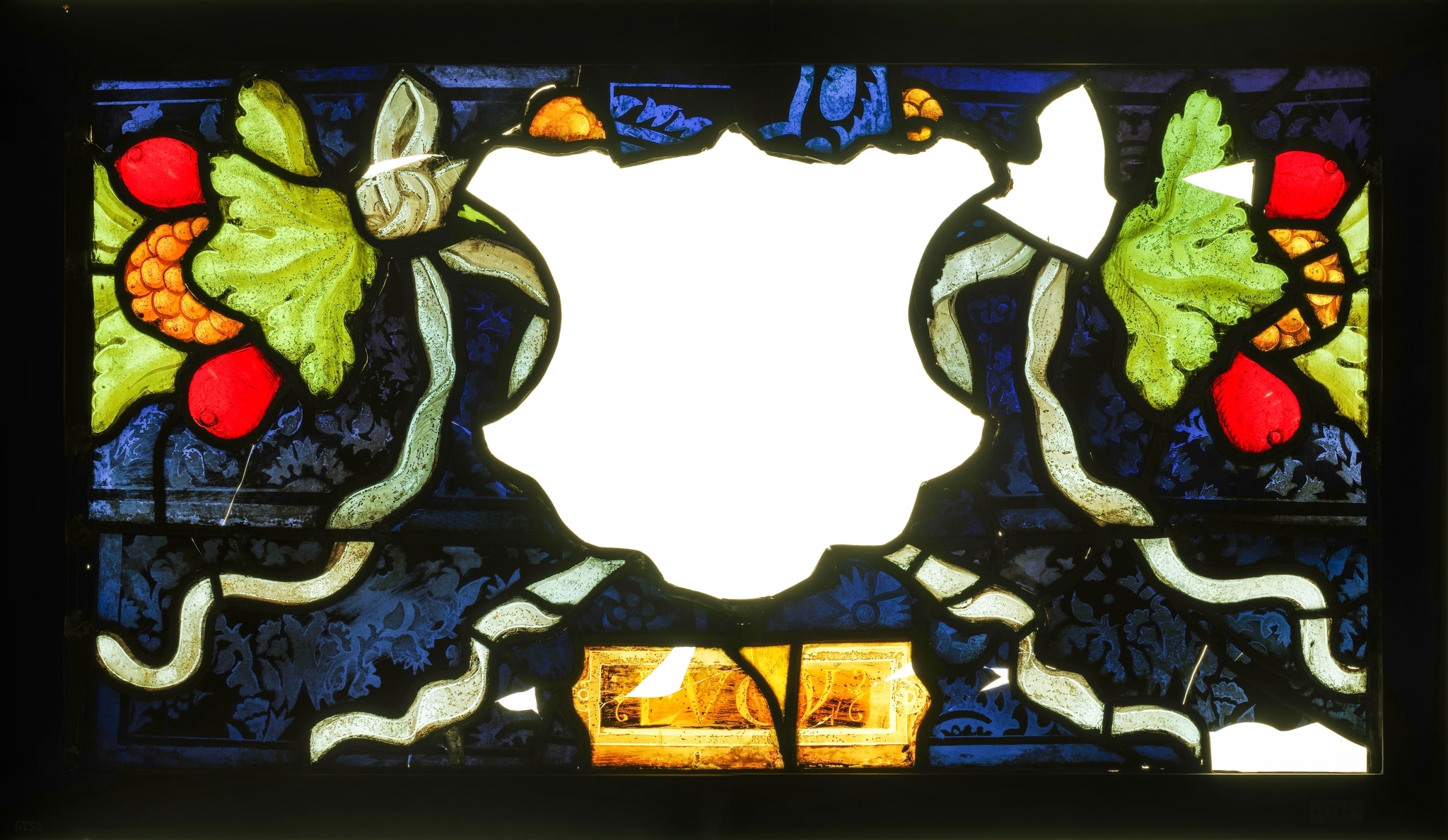 Un dessin conservé à la bibliothèque municipale de Nancy (Fonds Abel, carton 152, reproduit dans Isler-de Jongh, 1998, p. 156) représente la fenêtre intacte, avant sa vente. Dans la partie inférieure, trois écus armoriés sont illustrés côte à côte, insérés dans des couronnes, au-dessus de trois cartouches portant les noms des familles représentées. Celui de gauche est laissé vide, celui du centre illustre les armes et le nom de Lucy et celui de droite ceux de Savigny. Si ce dernier correspond au médaillon conservé au MET (inv. MMA 17.40.6), l’identification des deux autres médaillons demeure incertaine. Contrairement aux armes de Lucy figurées sur le dessin, le présent vitrail ne représente pas l’écu inséré au centre d’une couronne, mais flanqué de rubans et de guirlandes de feuilles et de fruits qui s’étendent au-delà des extrémités du panneau. Il pourrait dès lors avoir été au centre de la console décorative dessinée sous les médaillons. Le dessin imprécis et incomplet ne permet pas d’identifier avec certitude le présent panneau comme l’un de ceux insérés dans la partie basse de la fenêtre de la Création et de la Chute de l’Homme. Cependant, le nom et les armes de Lucy, tout comme son style, permettent de le rattacher à cet ensemble. Cette attribution permet ainsi de préciser la datation du vitrail estimée vers 1520 pour 1531-1533.