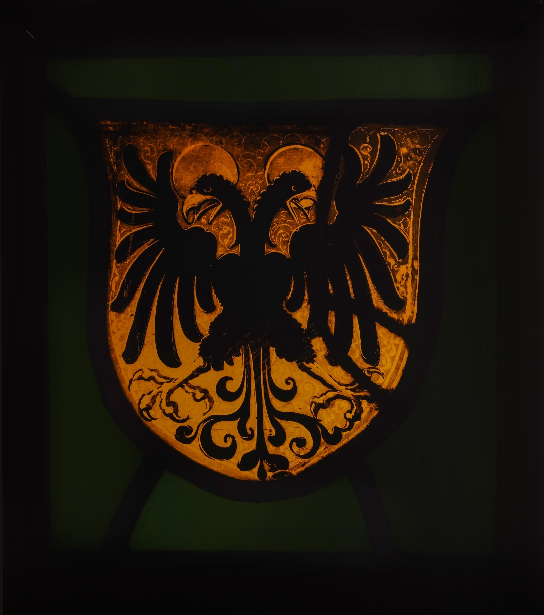 Fragment de vitrail aux armes du Saint-Empire romain germanique, représentant l’aigle bicéphale.