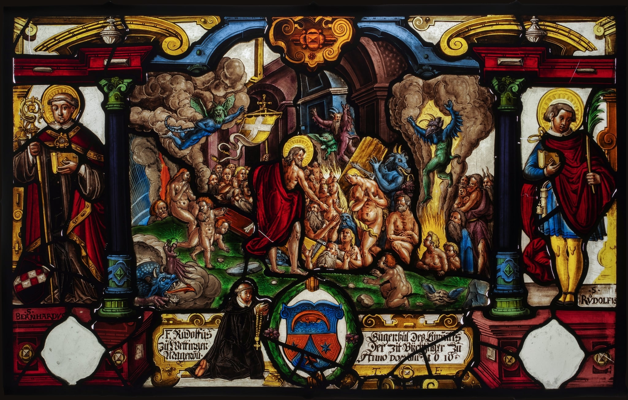 Ce vitrail fait partie des trente-sept panneaux connus provenant du cloître du monastère cistercien de Tänikon, en Thurgovie. Le présent panneau a été conçu comme une paire avec un second vitrail aujourd’hui disparu, mais connu au travers de la chronique du monastère comme une représentation de la Mise au tombeau aux armes du confesseur Kaspar von Aegeri (Boesch, 1943, p. 61, n° 42).