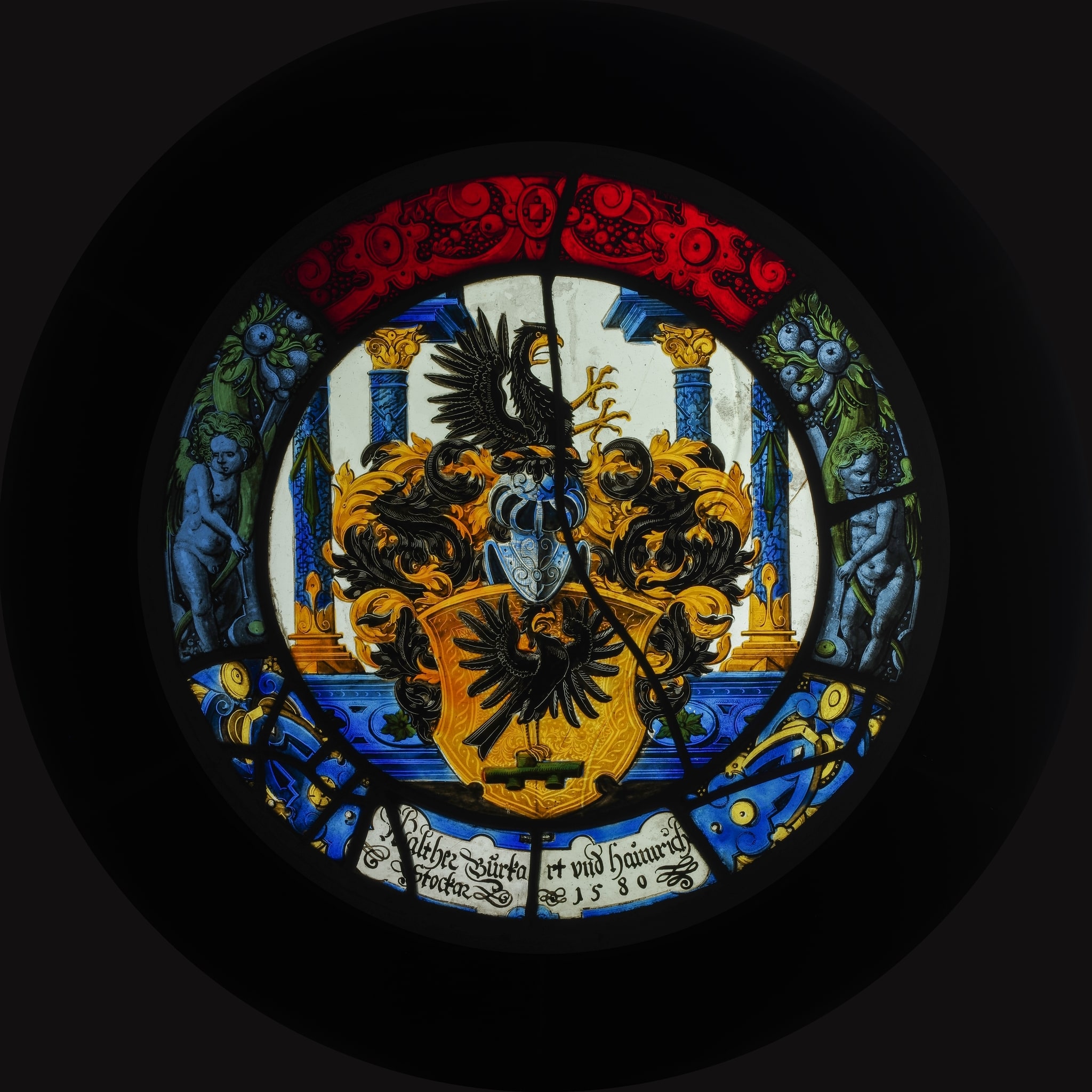 Le vitrail a été commandé en 1580 par Walther Burckhardt et Hans Heinrich Stokar (1551-1621). Burckhardt, n’est à ce jour pas identifié. Hans Heinrich Stokar, issu d’une famille patricienne de Schaffhouse, est notamment connu pour son rôle dans la bataille d’Ivry, au service de la France (DHBS, 1932, p. 374 ; Baertschi, 2011). Seules les armoiries de Stokar sont représentées sur le rondel, ce qui est inhabituel pour une donation à deux commanditaires. Malgré la correspondance entre le nom de l’inscription et les armoiries, il est possible que celles-ci aient à l’origine fait partie de deux panneaux distincts. L’hypothèse du remontage du médaillon est soutenue par la moitié supérieure de la bordure qui est composée de pièces de remploi. En l’absence de plus d’informations, le contexte de donation du panneau demeure inconnu.