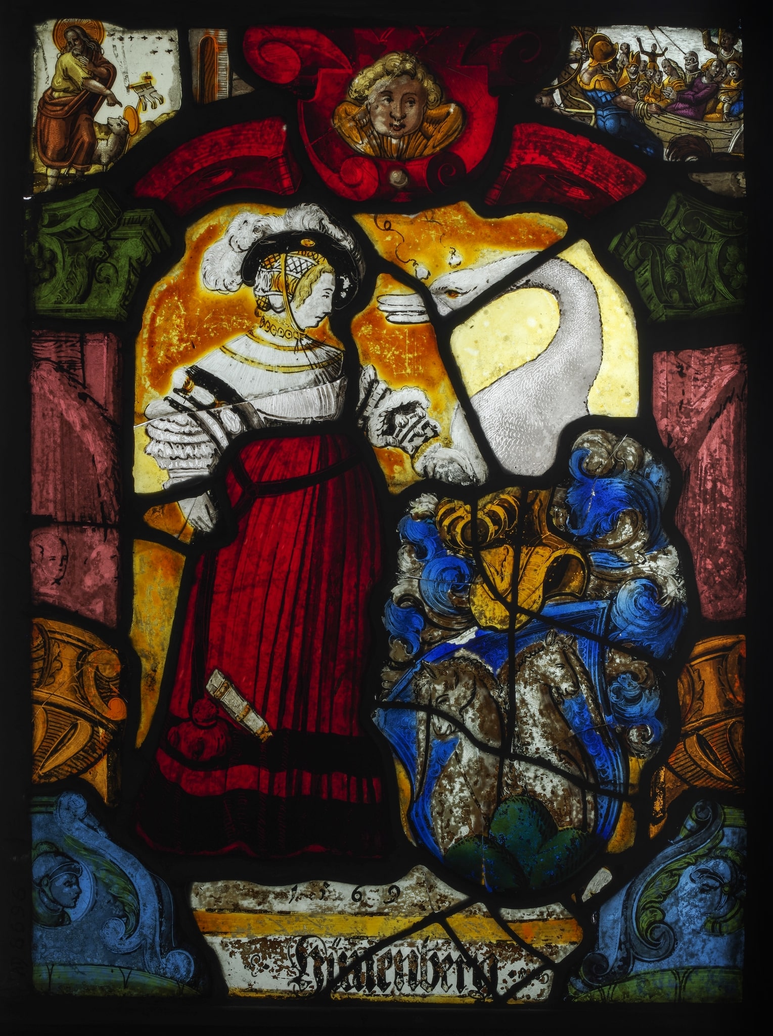 Le panneau a été donné en 1569 par la commune zougoise de Hünenberg. Un ancien inventaire attribue cette commande à la famille noble von Hünenberg, issue de Zoug, dont les armoiries sont similaires (Sidler, 1905, p. 104). La présence d’un mont de sinople sur lequel se dressent les licornes accolées étant propre aux armoiries de la commune (Iten & Zumbach, 1974, p. 238), l’écu représenté sur le vitrail ne correspond donc pas à celui de la famille. De plus, cette famille de chevaliers et de ministériaux étant progressivement tombée dans l’anonymat après avoir perdu l’essentiel de sa fortune à la fin du XVe siècle (Staub, 1943 ; Hälg-Steffen, 2021), il semble plus probable que ce panneau daté de la seconde moitié du XVIe siècle relève d’une commande de la ville. Bien que la présence d’une femme comme porte-écu soit plutôt rare sur les vitraux communaux, Bergmann (2004, p. 48) relève l’existence d’un premier vitrail héraldique d’iconographie similaire offert par Hünenberg vers 1555, recensé à Nostell Church (cf. Boesch, 1937, p. 114-115, n° 179). Un autre panneau daté de 1554 avec saints Jacques et Wolfgang encadrant l’écu de la commune, aujourd’hui perdu, se trouvait au château d’Amsoldingen (Bergmann, 2004, p. 48, fig. 32). Un fragment de vitrail héraldique de la commune datant du XVIIe siècle, aujourd’hui perdu, est également cité dans Boesch (1937, n° 151). Le Museum Burg de Zoug conserve un panneau communal daté de 1706 (inv. 3505, in Bergmann, 2004, p. 514, n° 292), attribué au peintre verrier zougois Franz Josef Müller (1658-1713).