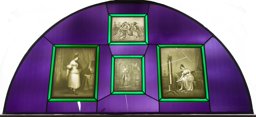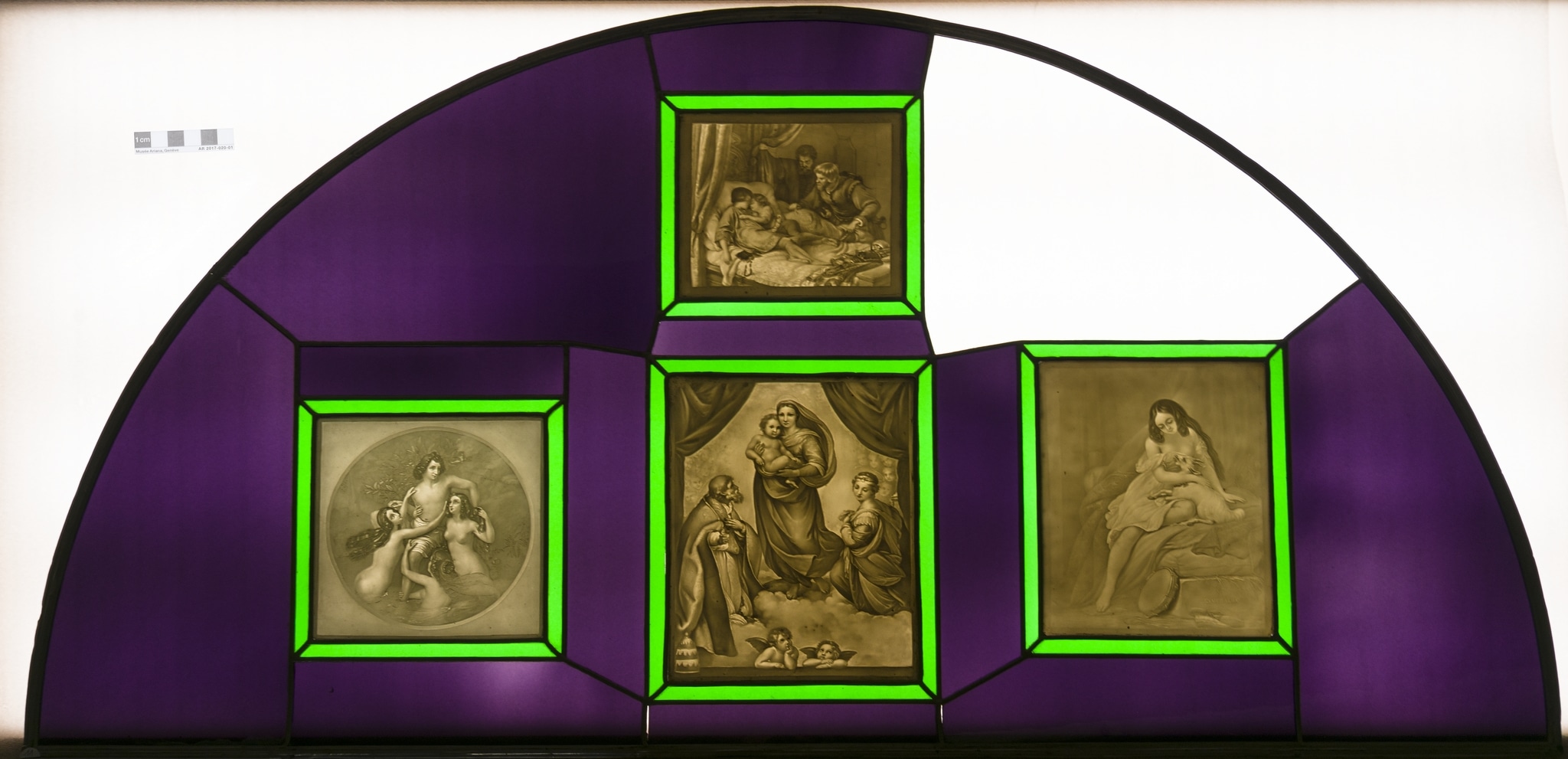 Quatre panneaux en lithophanie sont inscrits dans un vitrail au plomb en plein cintre, chacun d’entre eux étant encadré de verre vert sur un fond violet.