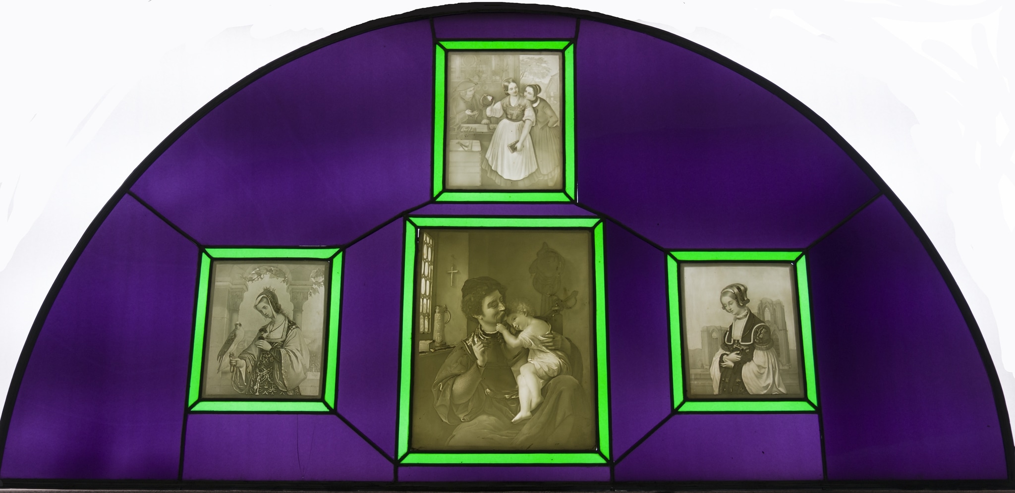 Les lithophanies inscrites dans ces vitraux colorés sont pour certaines des reproductions de tableaux très connus mais la majorité d'entre elles illustrent des scènes de genre ou des portraits.