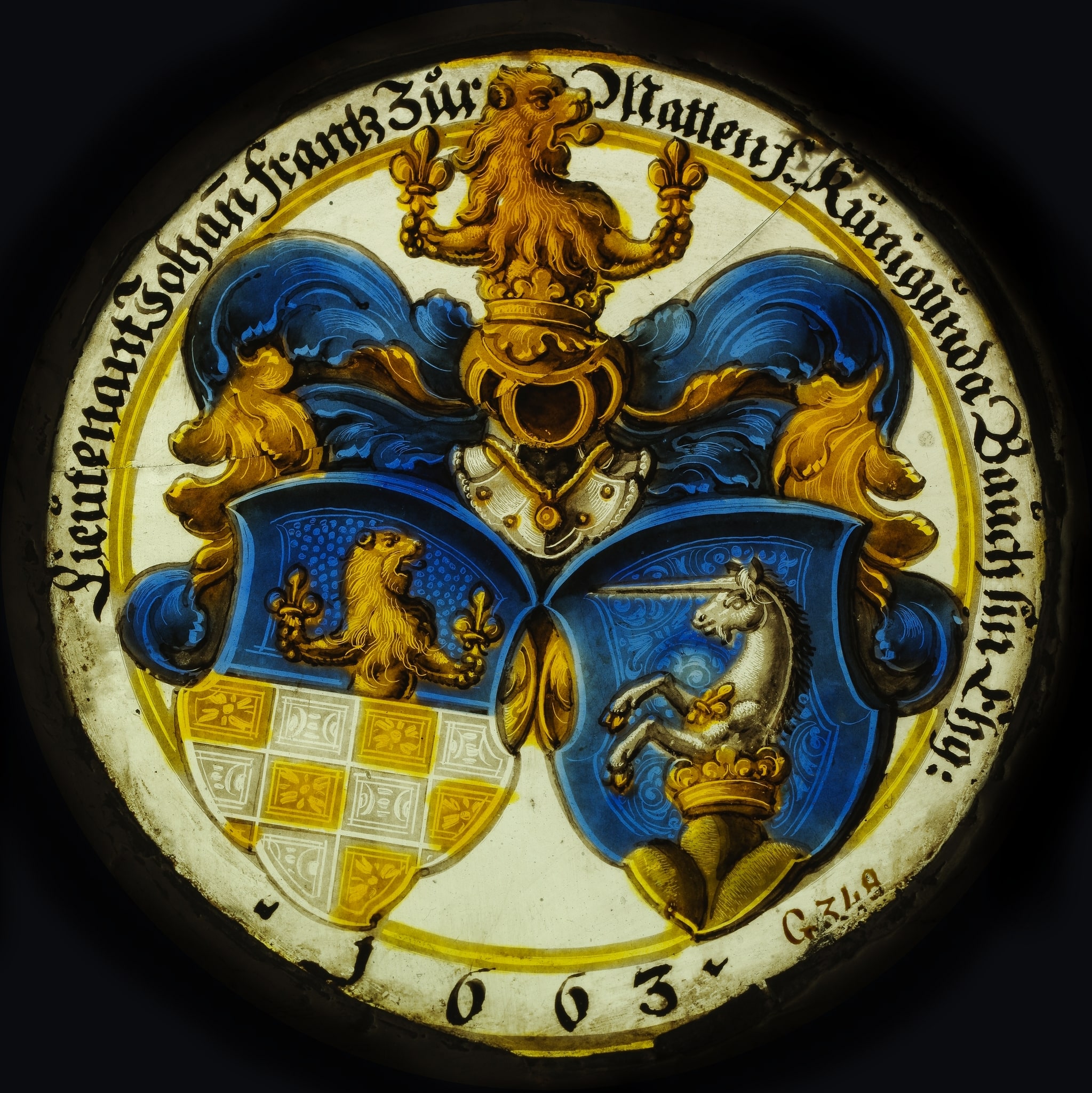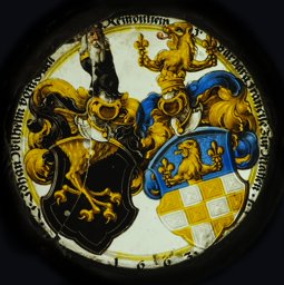 Ce médaillon forme un ensemble avec le rondel aux armes de Johann Wilhelm vom Staal et Barbara Franziska Zurmatten (GE_2261). Il a été commandé en 1663 par le couple de Soleure Kundigunde Buch (1638-1716) et Franz Zurmatten (1632-1671), marié en 1654 (HFLSa ; HFLSb). La donatrice du second panneau, Barbara, est la soeur du commanditaire Franz Zurmatten. La famille Buch, originaire de Vienne et reçue bourgeoise de Soleure en 1554, a principalement exercé l’activité d’apothicaire jusqu’au XVIIe siècle, avant de se tourner vers la politique (Sigrist, 2003). La famille Zurmatten, bourgeoise de Soleure en 1525, a été anoblie par le roi de France Charles IX en 1570, accédant ainsi au patriciat (Meyer, 2014). A ce jour, nous ne possédons pas plus d’informations sur les donateurs.