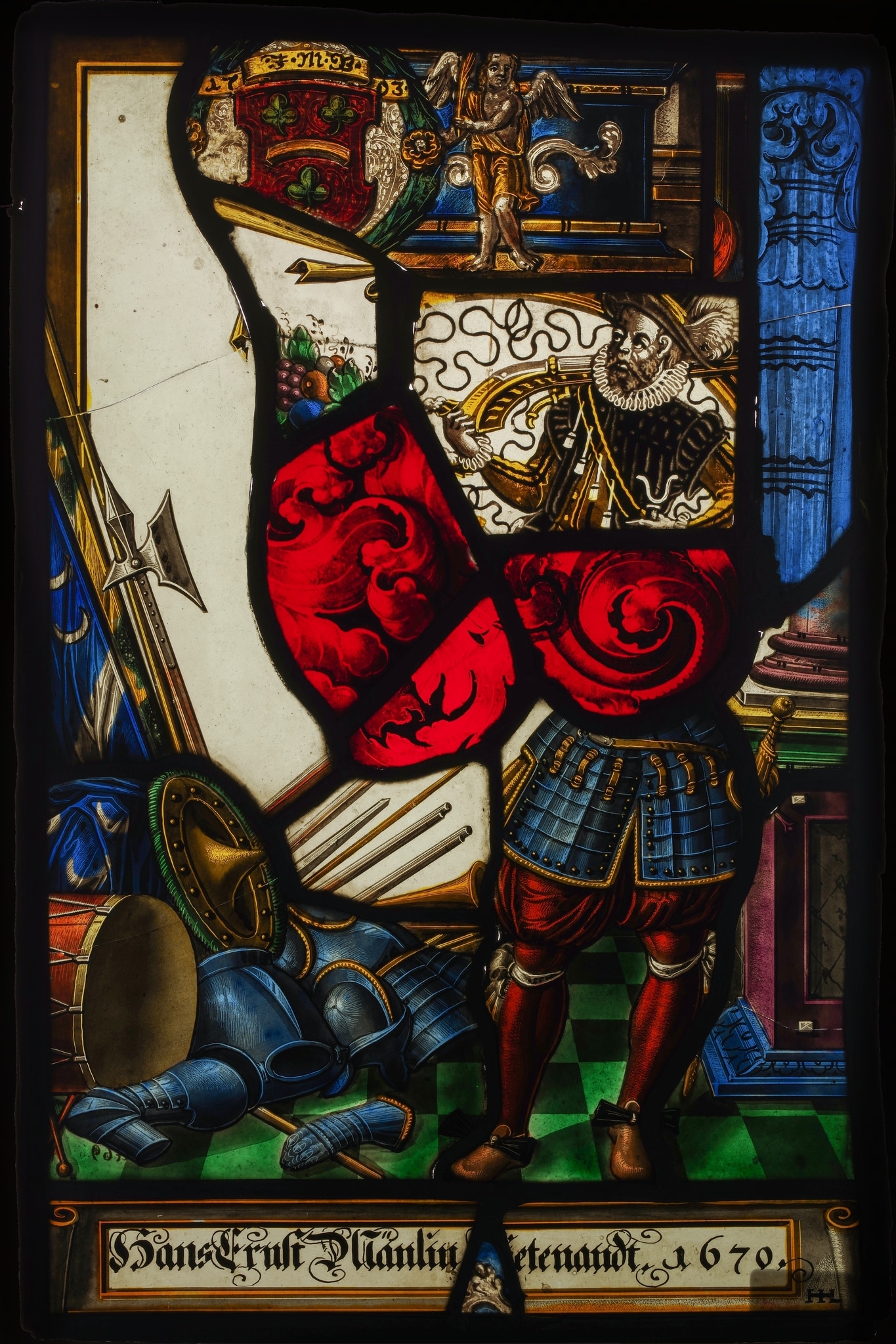 Vitrail composite représentant sur un sol carrelé vert du matériel militaire posé au sol, avec la partie basse d’un corps de soldat. La partie supérieure droite est composée de pièces de remploi disparates, figurant un buste d’homme tenant un fusil à l’épaule, des fragments de panache, un morceau de colonnes ou encore un entablement avec un écu armorié encadré d’une couronne de feuilles tenue par un ange. La partie inférieure est ornée d’un cartouche avec une inscription du donateur.