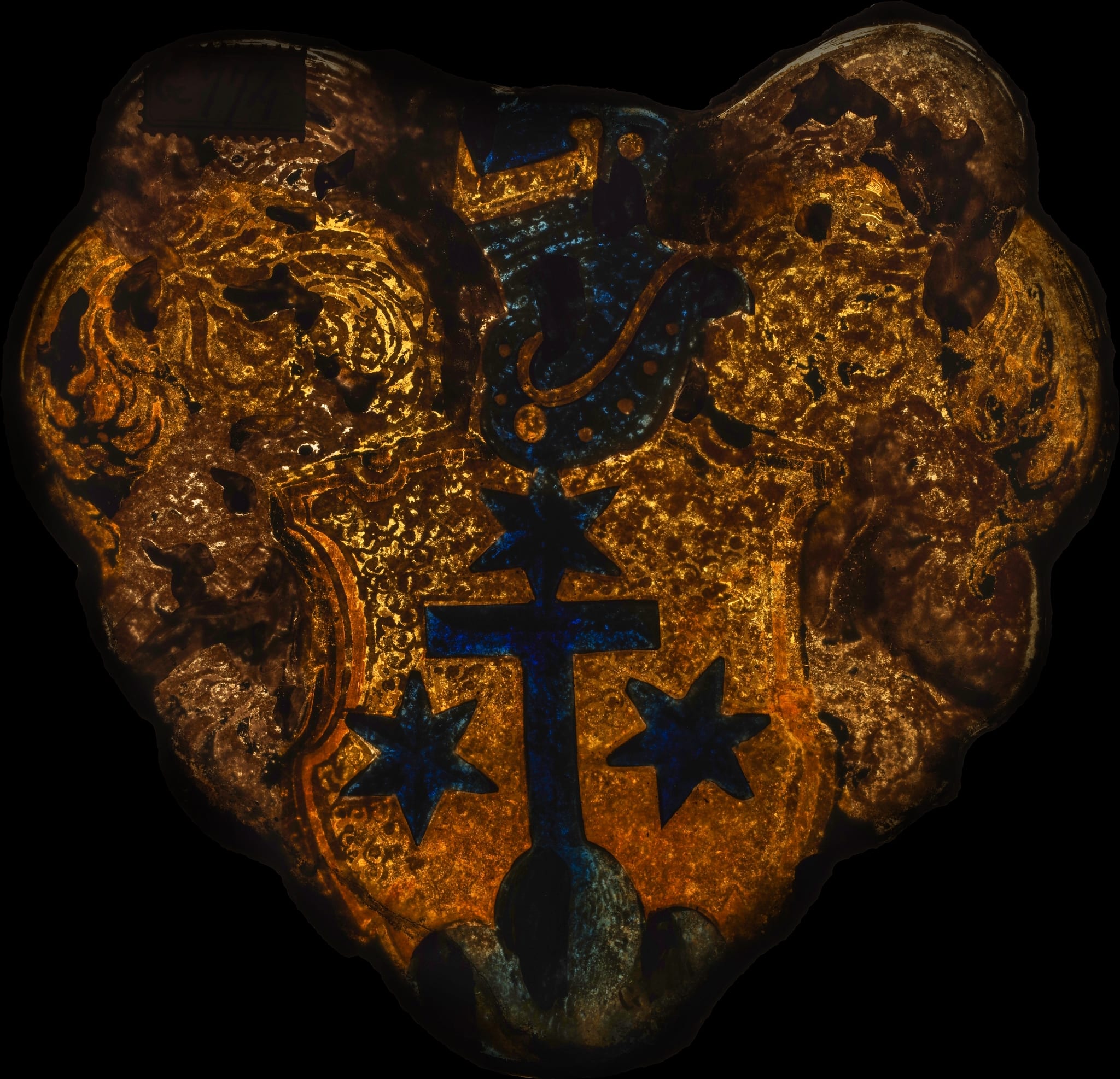 En l’absence d’inscription ou de cimier, les armoiries représentées sur ce fragment de vitrail ne peuvent pas être identifiées avec certitude. Il pourrait s’agir d’une famille suisse issue du canton du Valais, comme les de Kalbermatten, Niggeli ou Tscherrig, dont les armes présentent des similitudes au niveau du dessin, mais dont les couleurs diffèrent quelque peu (ACV, 1946, pl. 4, 9, 16). Cette provenance valaisanne est appuyée par l’achat du fragment en 1890 auprès de l’artiste peintre Franzoni à Sion.