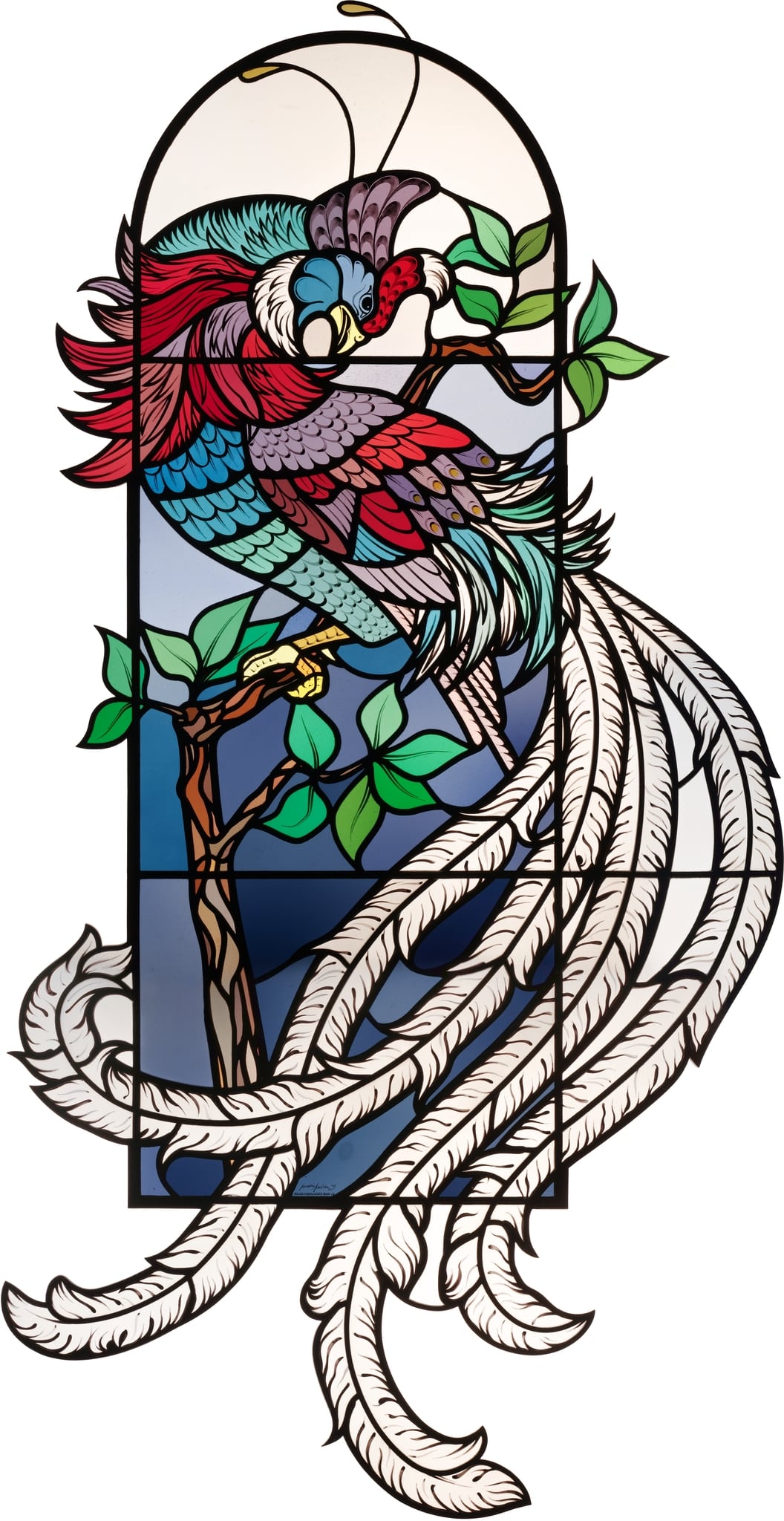 Pour cette oeuvre verrière, l’artiste a également souhaité faire don au Musée Ariana de la maquette, dessin définitif (GE_2378) à l’échelle réduite sur la base duquel il a élaboré le vitrail. Lorsque celui-ci est mis en plomb, le peintre verrier a apposé la peinture à la grisaille de manière très précise sur le recto et le verso de certains verres pour dessiner le plumage. Pour les points jaunes disposés sur la pointes des plumes mauves et roses, il a choisit des verres plaqués permettant d’ôter à l’acide la couche supérieure de verre jaune pour ne laisser apparaître plus que les points. Il a également fait un travail très fin sur le plomb. Celui-ci est ciselé à certains endroits du plumage de l’oiseau, alors qu’à d’autres endroits, il lui a apporté une certaine épaisseur afin de créer des ombres sur le verre.