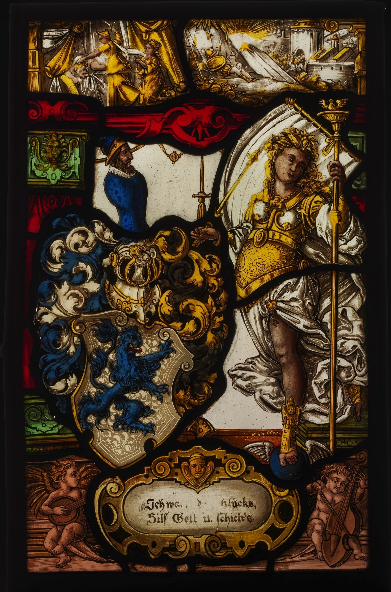 Vitrail rectangulaire représentant au centre d’un cadre architectural un blason armorié surmonté d’un heaume empanaché avec en cimier un buste d’homme, flanqué à droite d’une femme en armure portant un étendard. Dans la partie supérieure se trouve deux scènes : à gauche la décapitation d’Holopherne par Judith sous les yeux de sa servante agenouillée et à droite des soldats israélites sortant de Béthulie pour attaquer les troupes assyriennes. Le soubassement figure un cartouche avec une inscription du donateur entre deux putti musiciens.