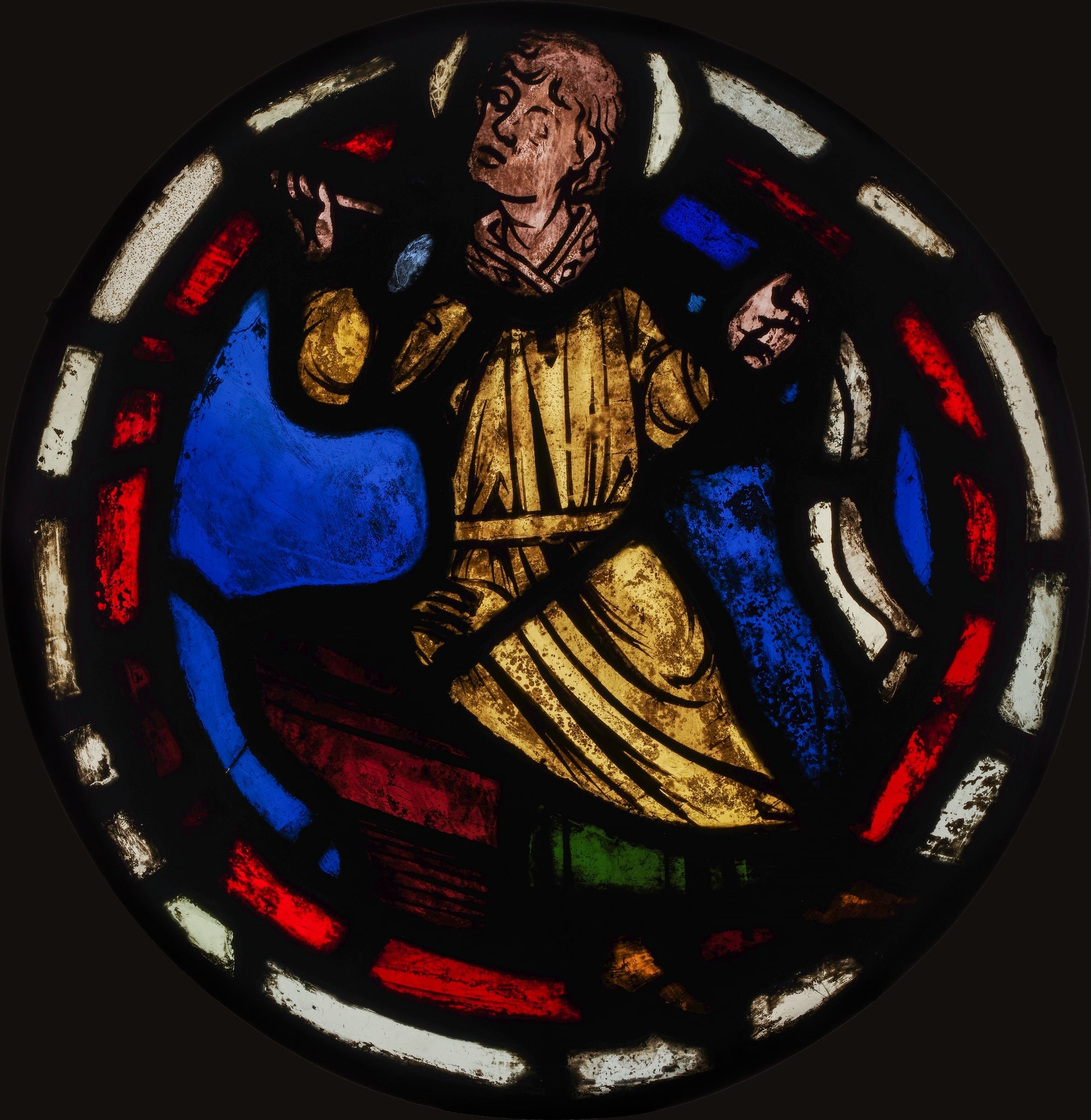 Ce médaillon présente une composition quelque peu étrange, peut-être due à une reconstitution totale ou partielle du panneau. Le saint personnage rappelle les figures des prophètes, telles qu'elles apparaissent par exemple dans les trilobes des fenêtres du choeur de la Sainte-Chapelle à Paris, conçus vers 1243-1248 (Aubert et al., 1959, p. 159–240). La localisation d'origine du présent médaillon est inconnue. Il pourrait provenir d'une atelier français. Plusieurs panneaux des collections de l'Ariana proviennent de France, à l'instar de l'ensemble issu de Saint-Fargeau (cf. GE_2157 et suivantes) et de la paire provenant de Notre-Dame de Paris (GE_2179, GE_2180), achetés par le collectionneur Gustave Revilliod. Comme le présent vitrail possède des différences de style et de format, il ne peut cependant pas provenir de l'un de ces cycles.