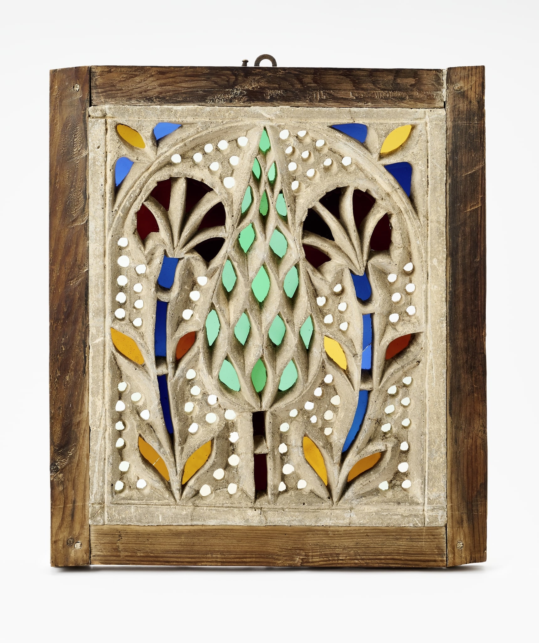 Latticework carved into a rectangular stucco panel and inlaid with pieces of colourless and coloured sheet glass.