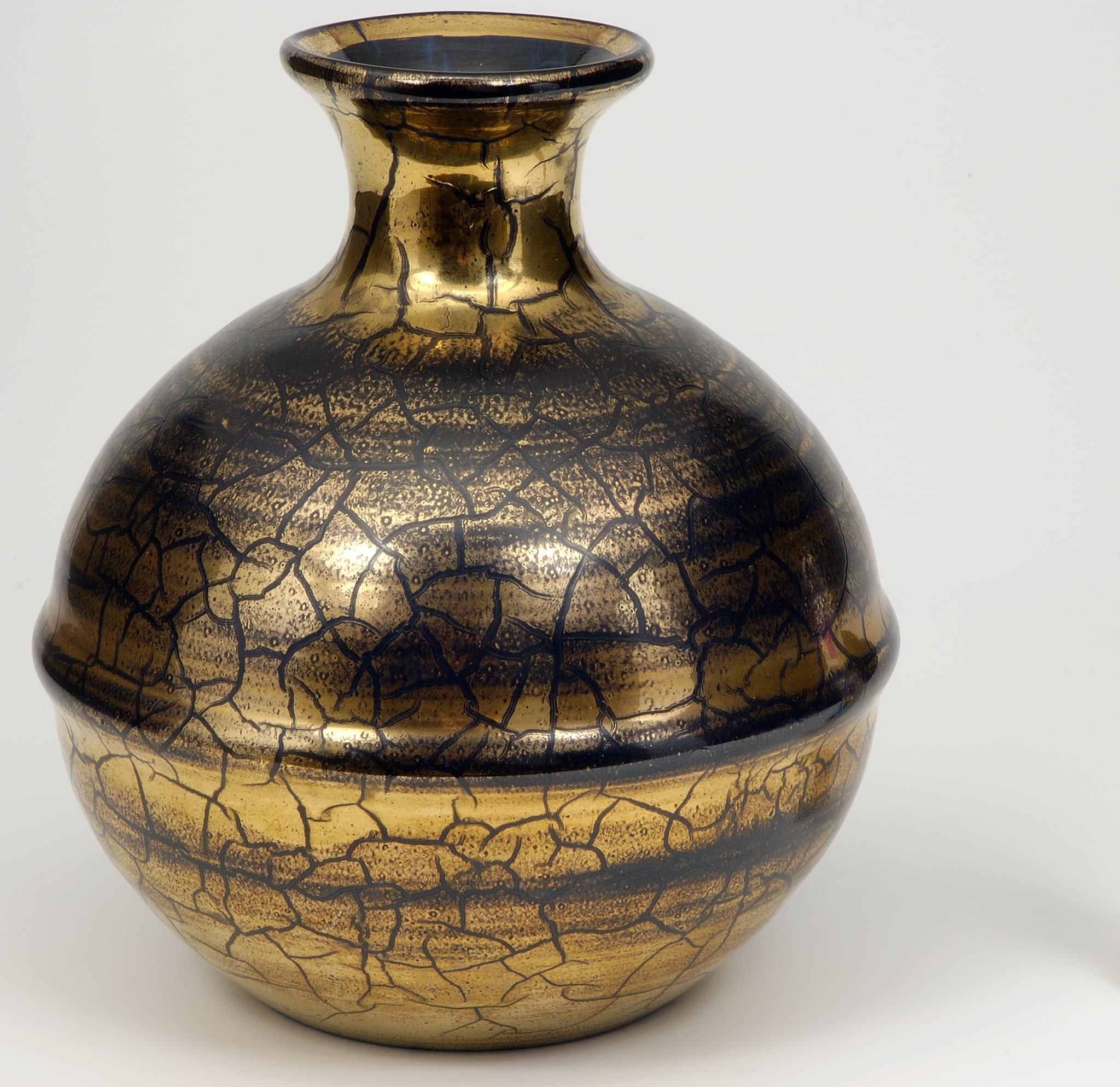 Verre vert soufflé en moule, petit col évasé, revêtement émaillé bleu et or, les craquelures apparaissant lors de la cuisson qui fixe le décor; forme: sphérique, renflement médian