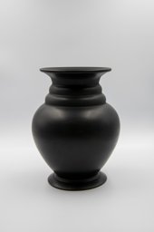 Verre turquoise, soufflé en moule, col large à deux renflements, pied appliqué, revêtement émaillé noir posé à l'aérographe; forme: panse ovoïde