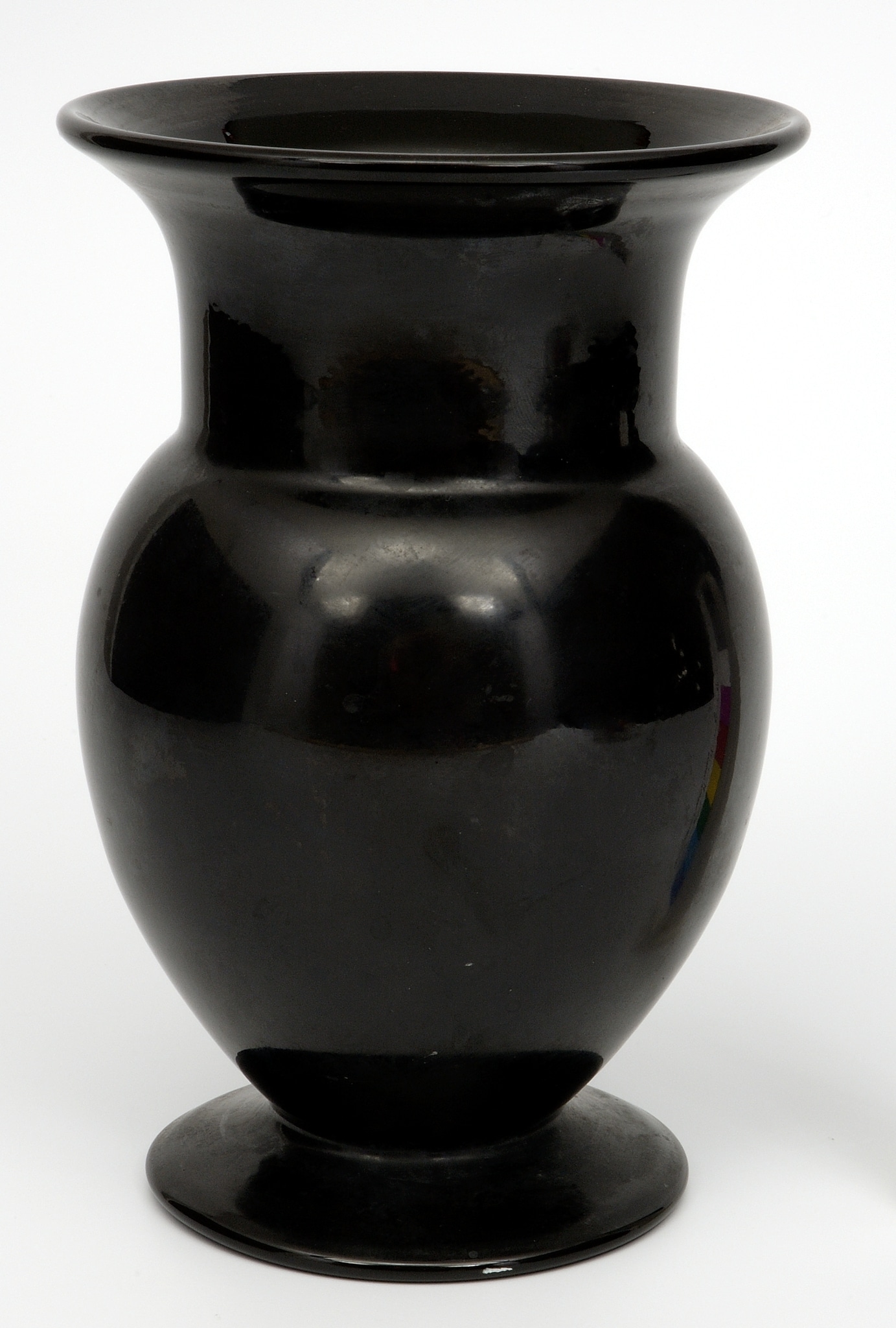 L'étiquette commerciale indiquant le numéro de modèle en usage après 1935 permet un terminus post quem du vase présenté. En revanche, le revêtement émaillé noir faisait déjà partie du catalogue en usage de 1931 à 1935. Il évoque les fameuses terres lustrées noires du céramiste Paul Ami Bonifas.