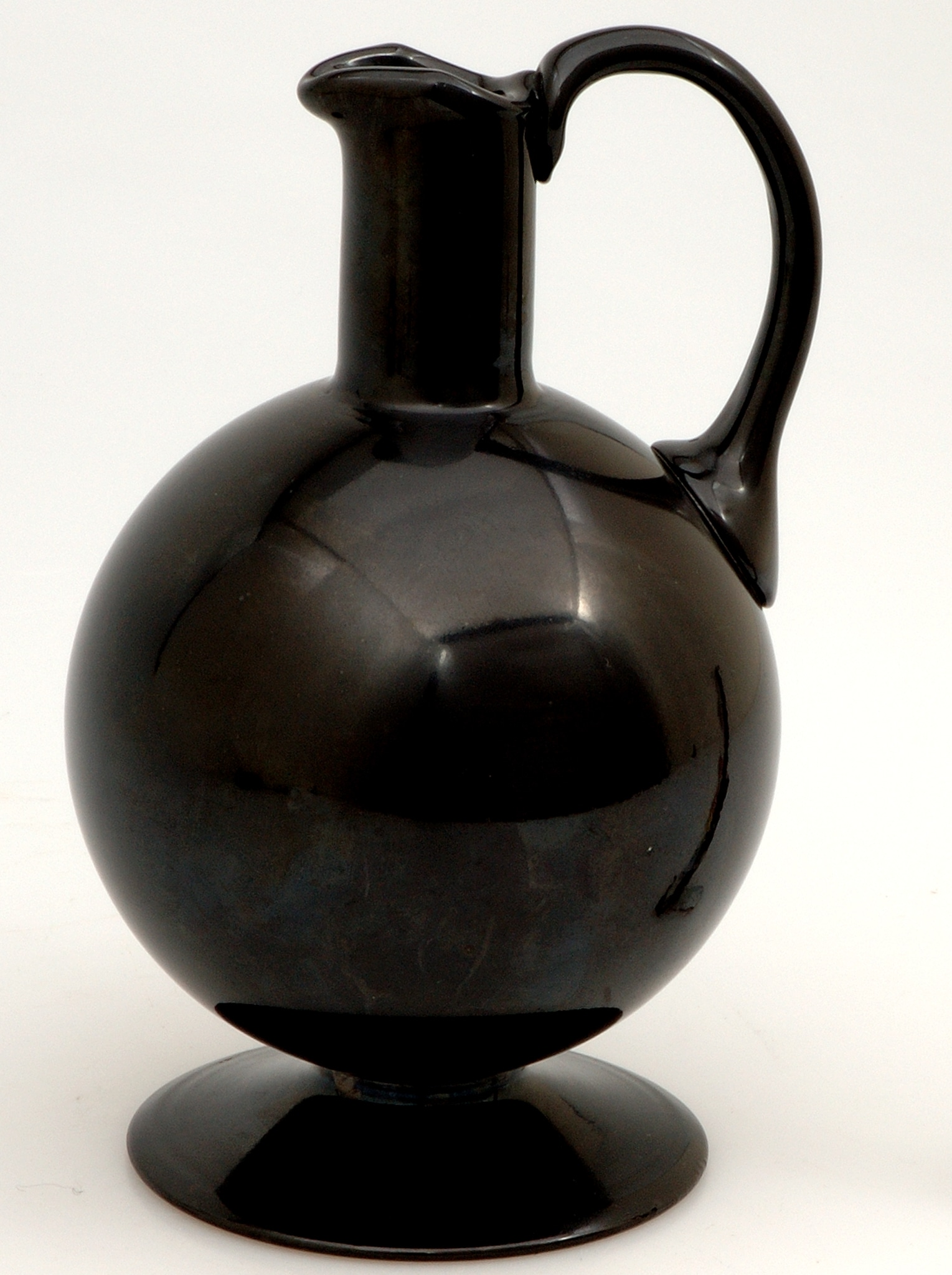 Verre vert, soufflé en moule, col droit, bec verseur, pied et anse appliqués, revêtement émaillé noir posé à l'aérographe; forme: panse sphérique